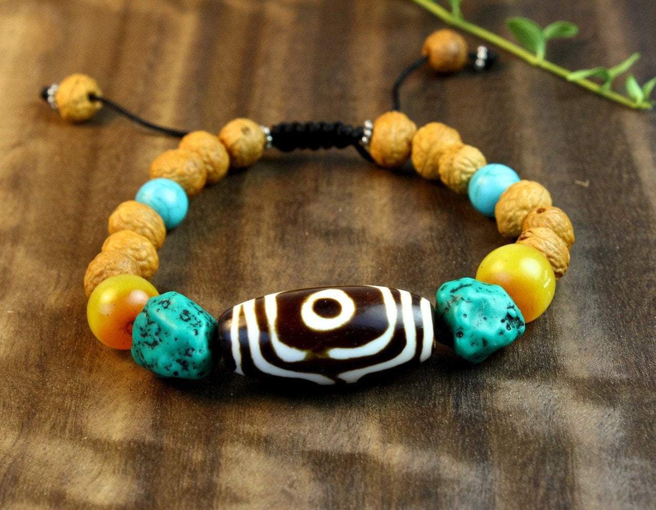 Three Eyed Dzi bead bone bracelet featuring raktu seeds, turquoise beads, and resin copal spacer beads.