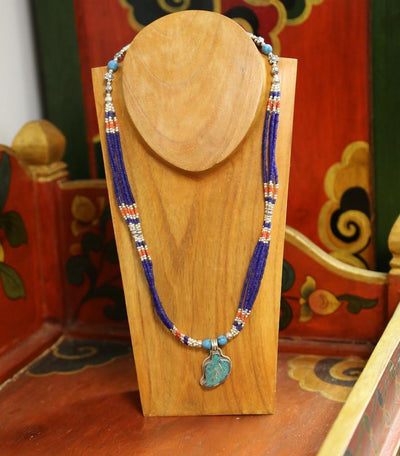 Handmade in Nepal with turquoise and coral beads connecting a turquoise leaf design.