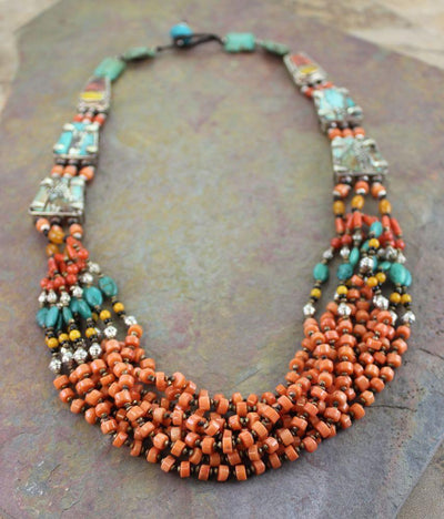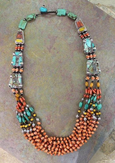 This necklace is exceptional in every way. True coral and turquoise beads linked to vintage style silver Tibetan beads.
