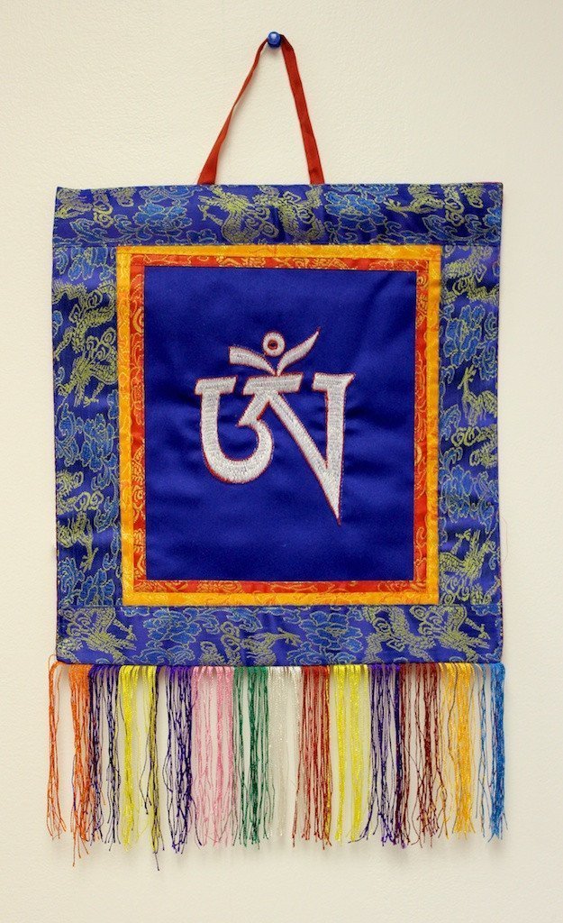 Beautifully colorful, this large wall hanging is embroidered with the Tibetan 'Om' symbol. This wall hanging has multicolored fringe on the bottom of a blue, red, and yellow wall hanging.