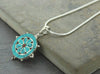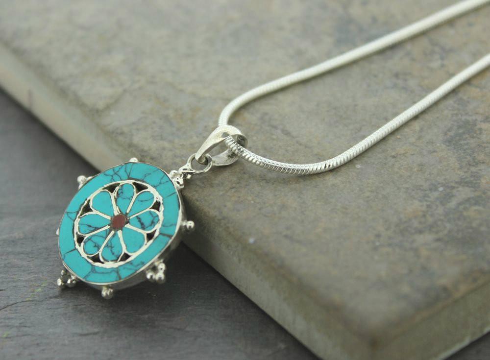 Awesome little dharma wheel pendant with turquoise set in .925 sterling silver. Measures about 1 inch tall and 7/8 inch wide.