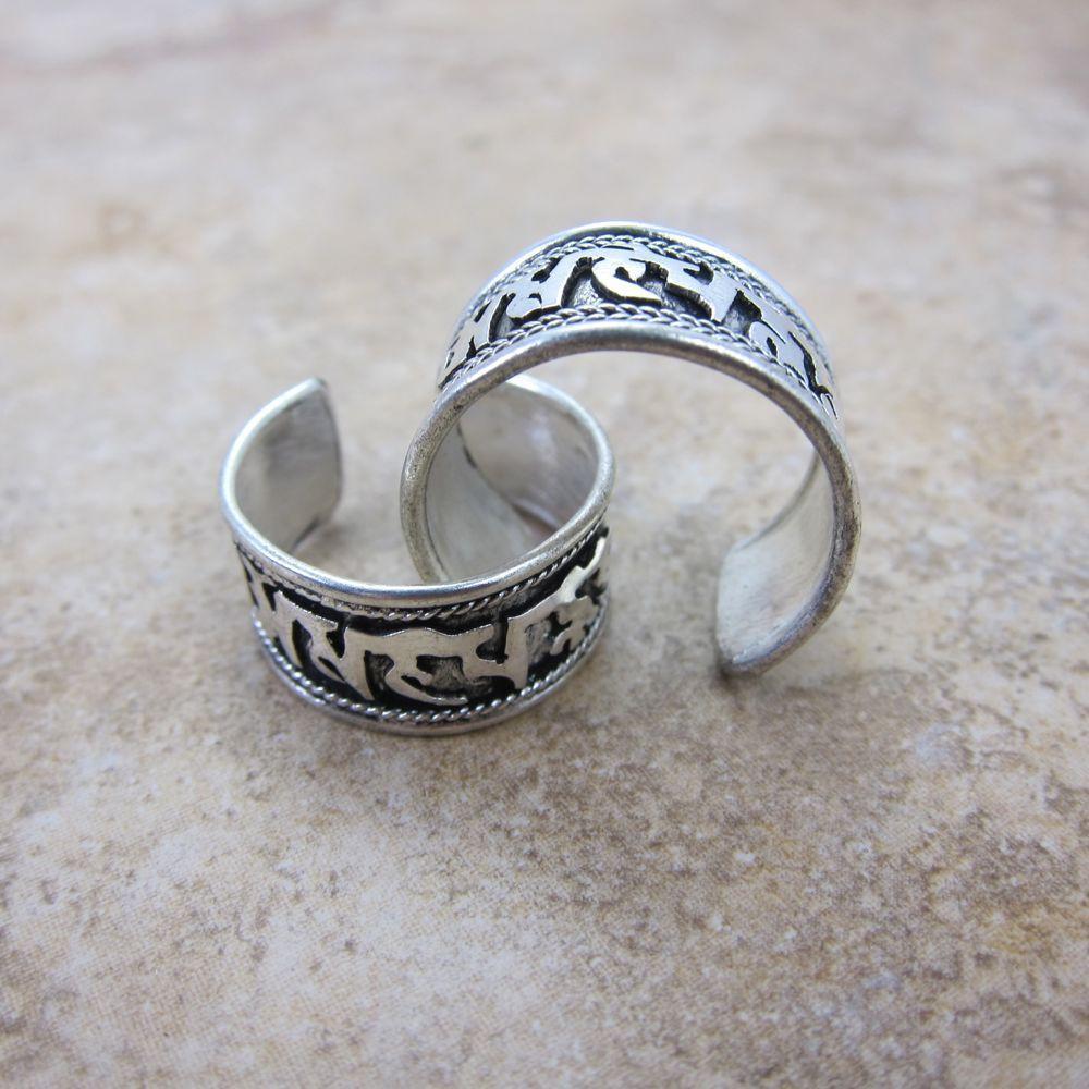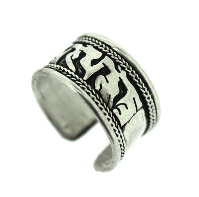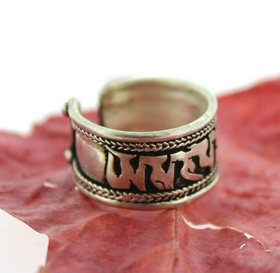 Written in Sanskrit Om Mani Padme Hung, the Tibetan Prayer for Compassion. With the price of silver at an all time high, solid silver jewelry is getting very expensive. We had this white metal ring silver plated therefore it is more budget friendly and won't leave your finger green.