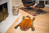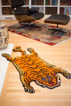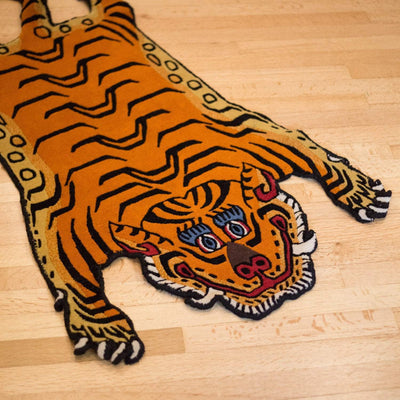 Medium sized rug measures approximately 4'5" by 2'5". Each tiger carpet is made with 100% Tibetan and New Zealand wool that features a higher lanolin content, allowing water to bead on the surface of the carpet. Made in Nepal.