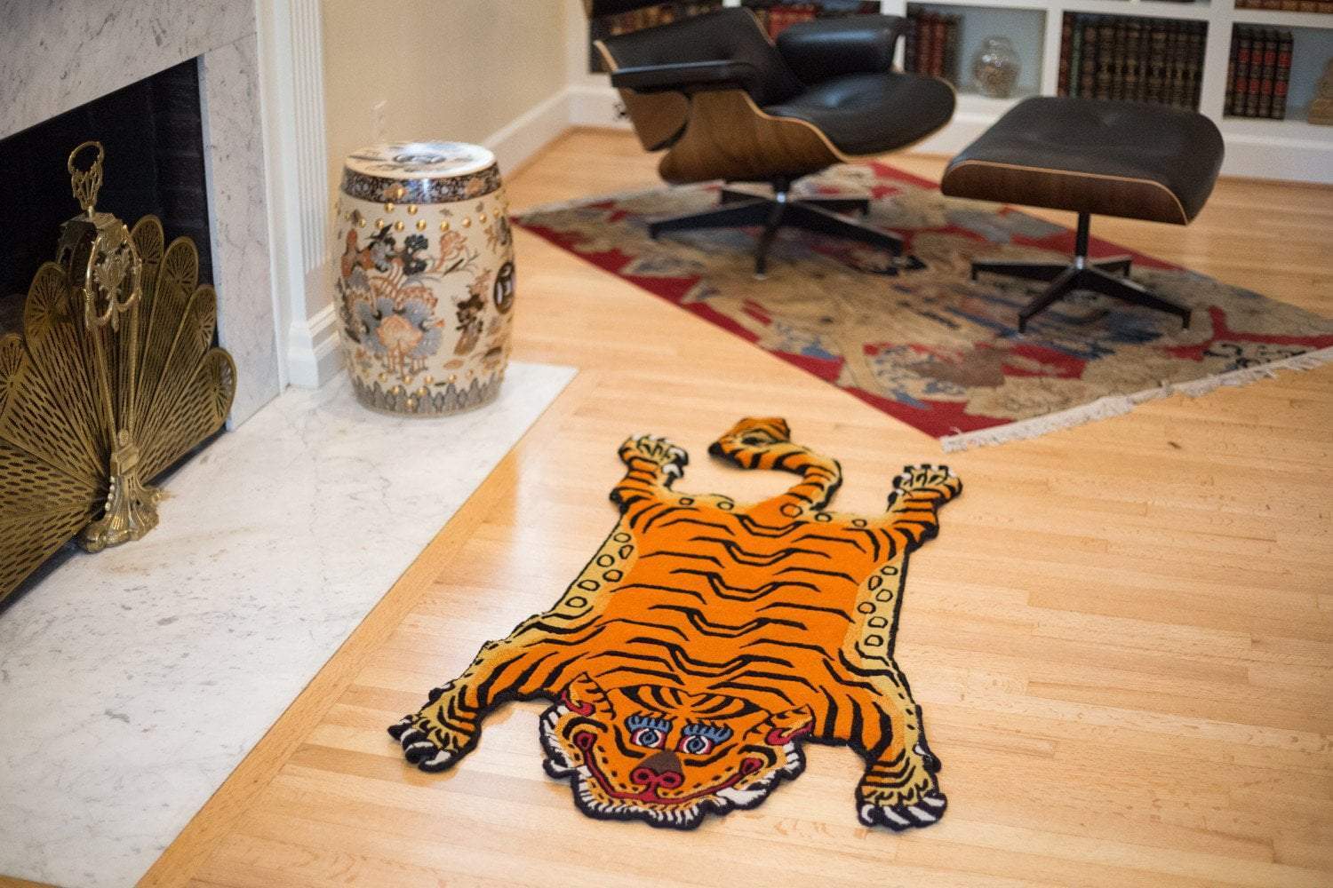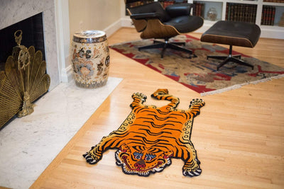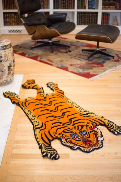 This one-of-a-kind Tibetan tiger carpet is the perfect addition to your home, office, or meditation space. Made in the traditional manner, each design is cut by hand to create a 3-dimensional look that emulates a real tiger skin. They are woven by hand on looms and feature 100 knots per square inch. Tibetan carpets and tiger rugs are truly beautiful pieces of art known for their quality and longevity.
