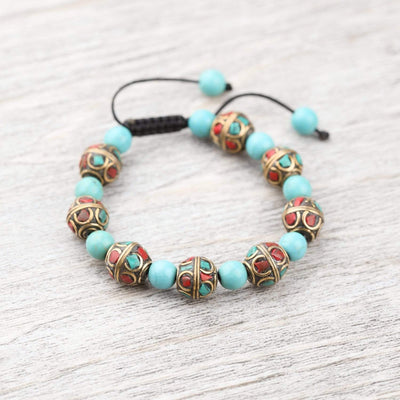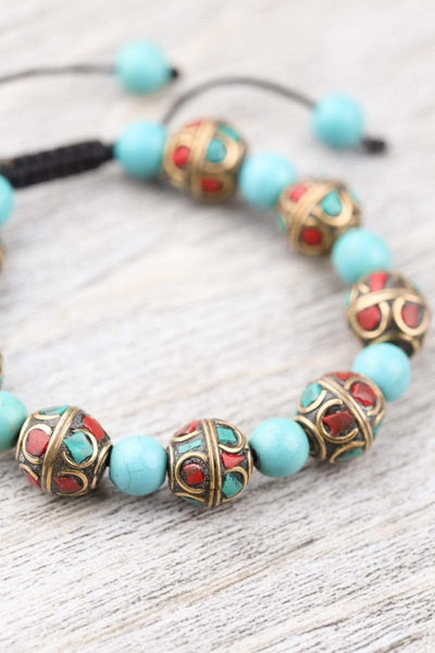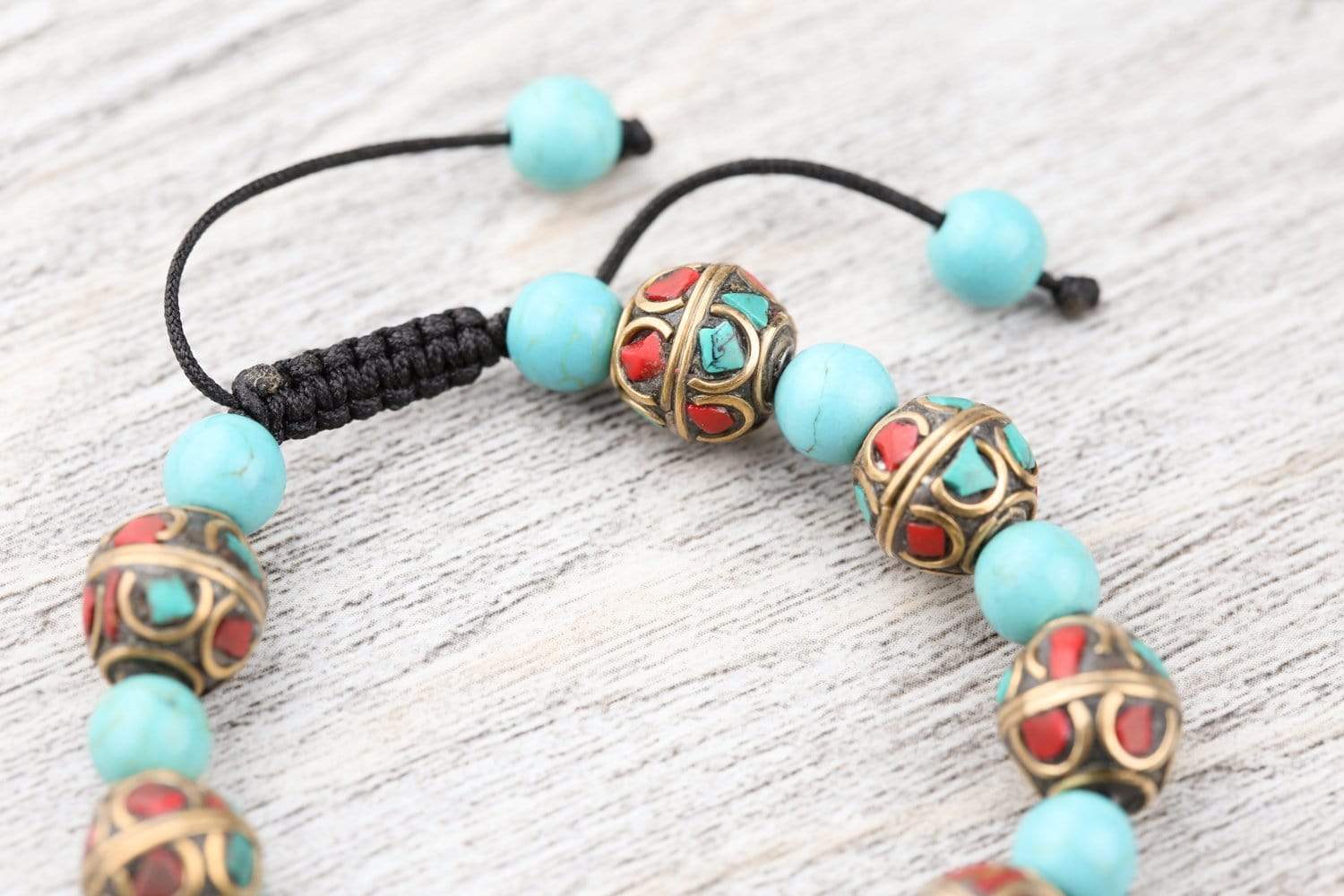 Adjustable wrist mala measures approximately 6 inches around when fully tightened and opens to about 9 inches. Turquoise beads are 8mm, vintage Tibetan beads are 12mm.