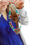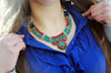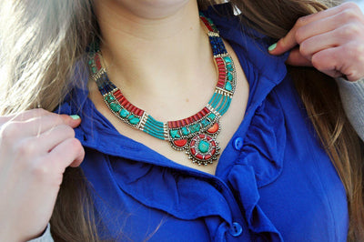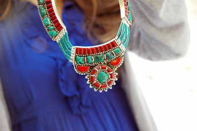 Bright and colorful, this Tibetan necklace is very traditional. Featuring inlaid turquoise and coral silver beads with strings of tiny turquoise and cobalt beads. Accented with silver beads all around.