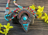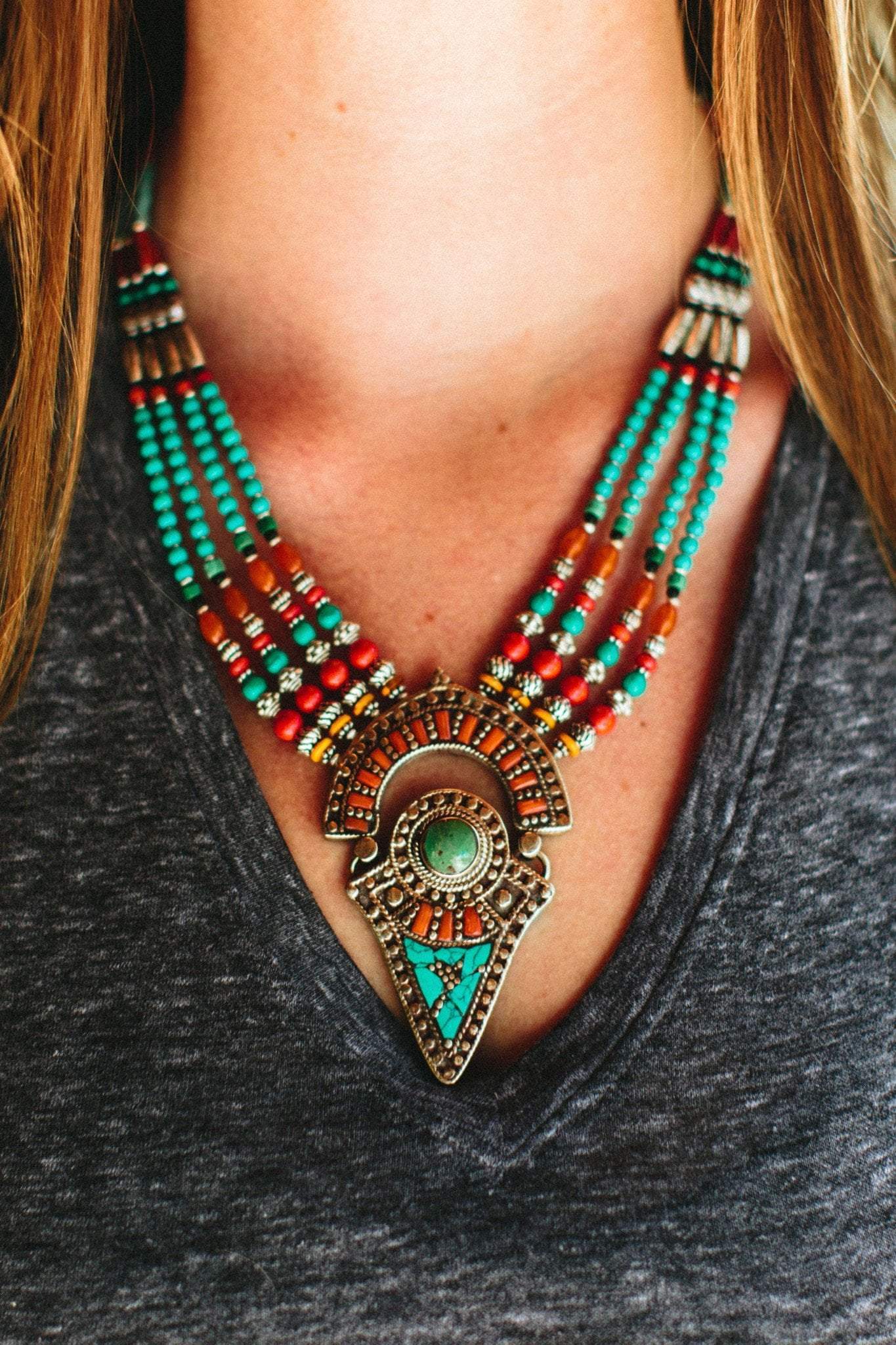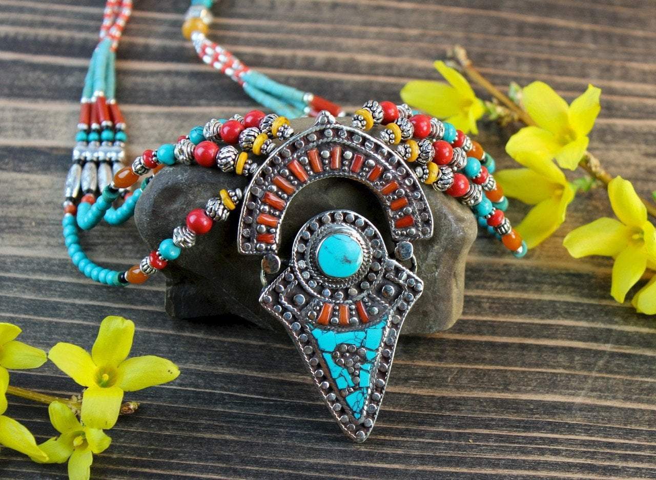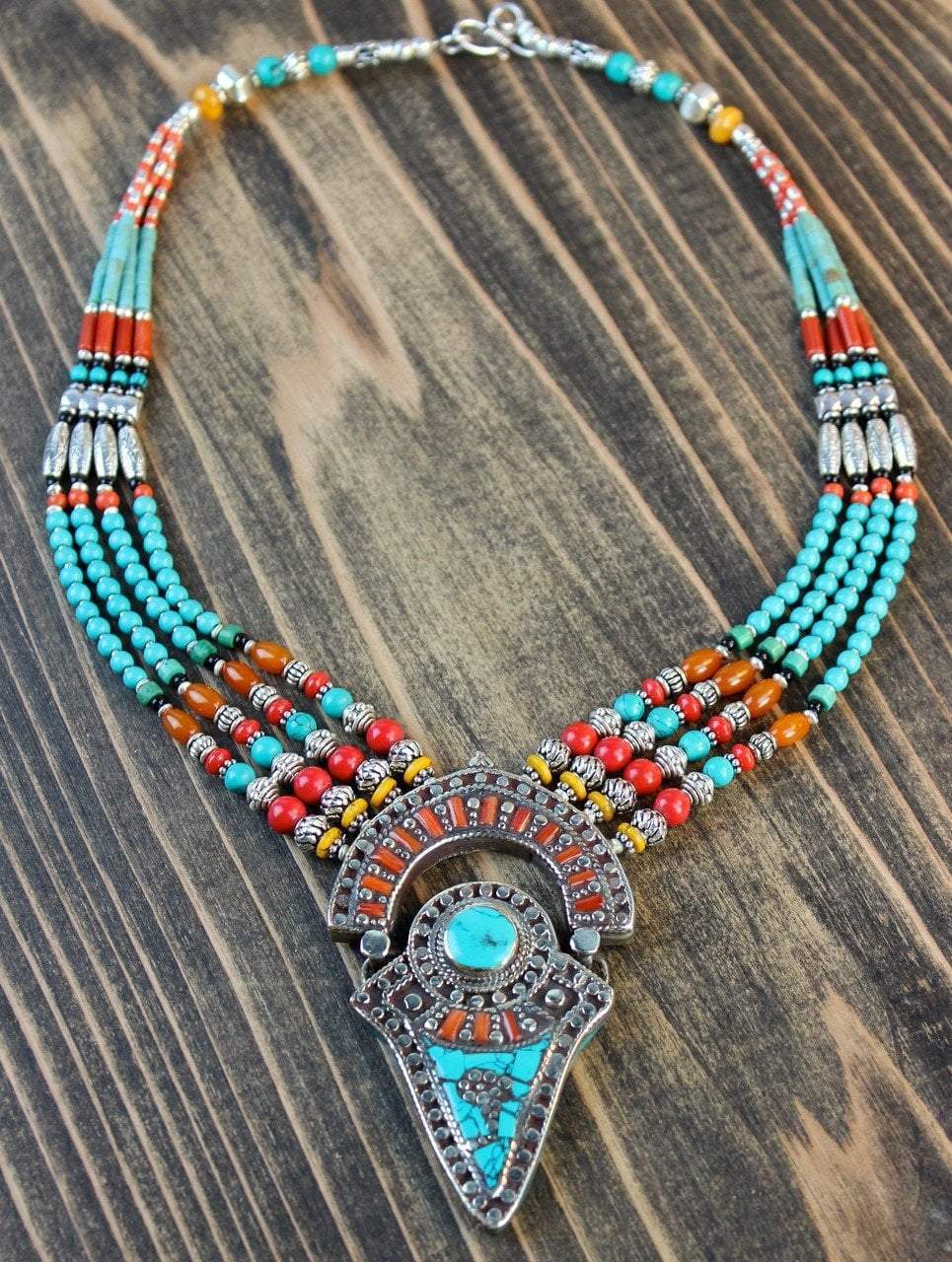Stunning four strand necklace with turquoise, coral, and amber beads. Hill tribe silver beads accent the necklace throughout. Features an awesome inlaid turquoise focal piece. This necklace has a traditional design with colorful flare.