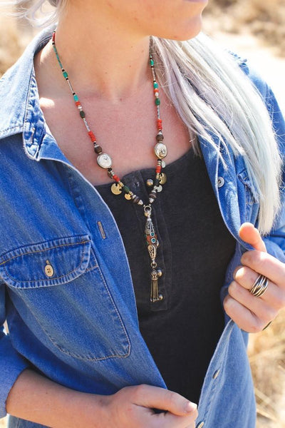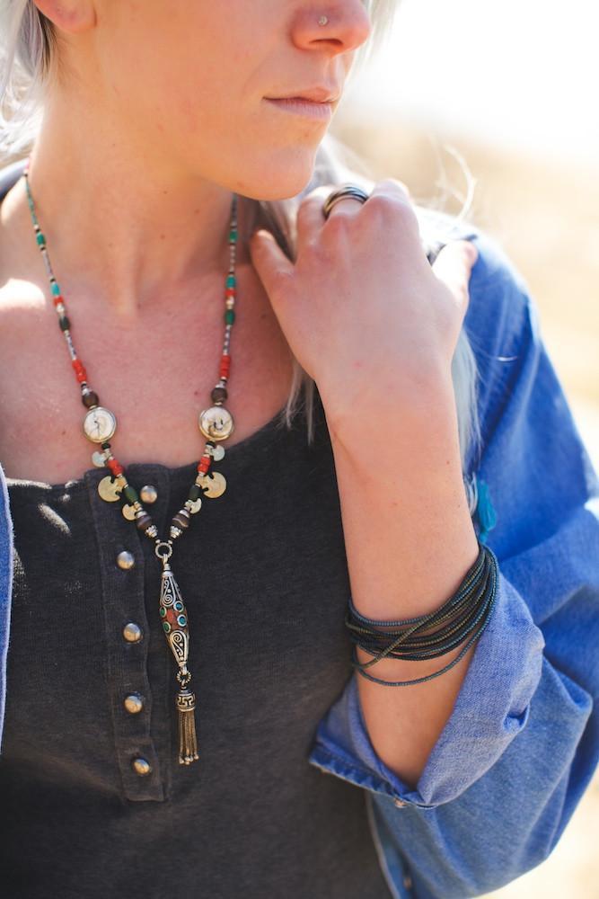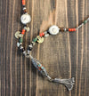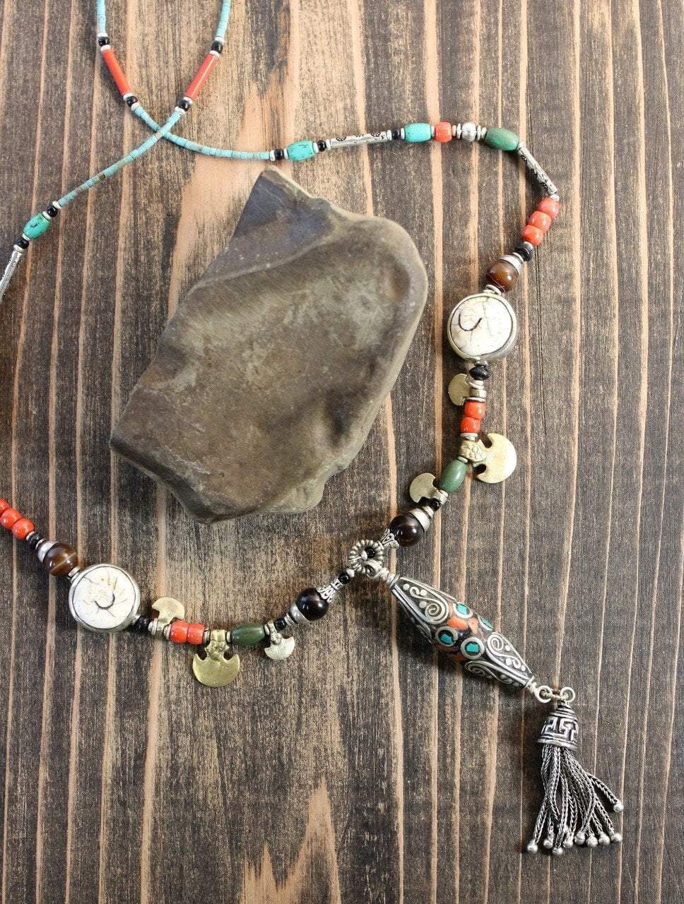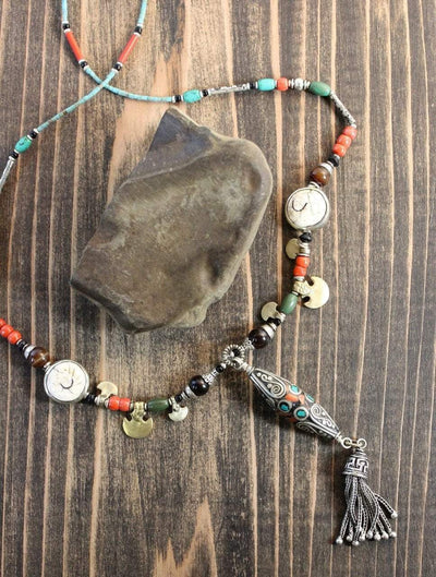 An amazing traditional necklace created by Tibetan artist Qazi in Kathmandu, Nepal. A unique and amazing design with coral, naga shell, and turquoise inlaid Tibetan beads.