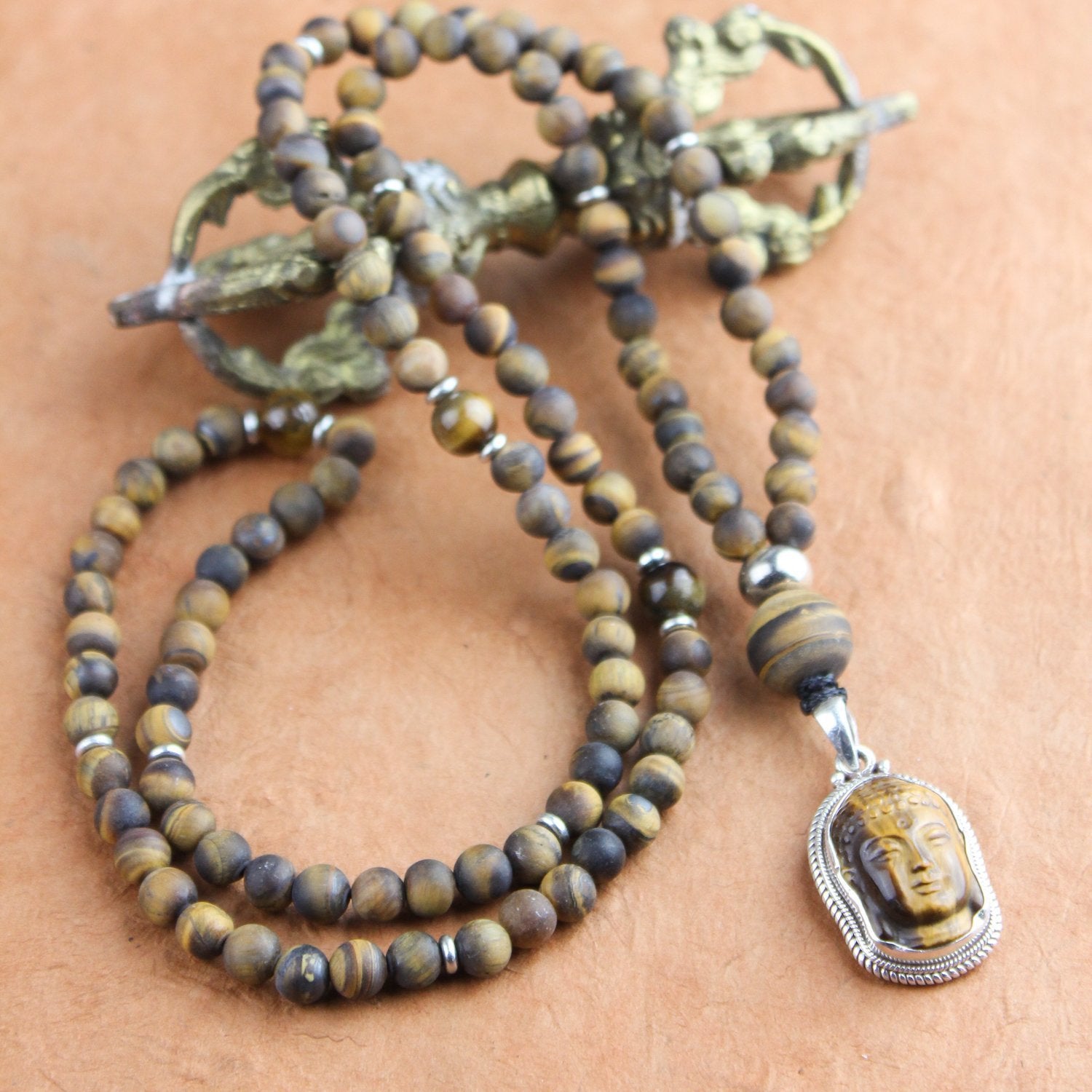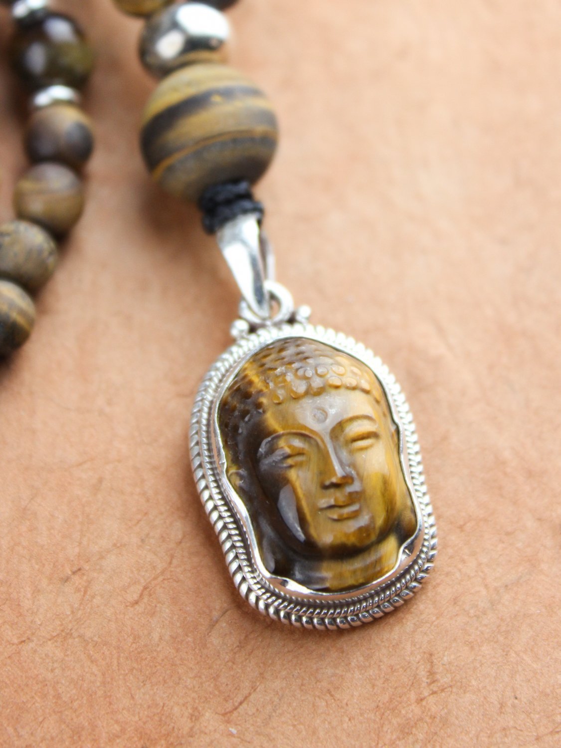 This 108 bead mala is designed and strung right here at the DharmaShop featuring a combination of matte and polished Tiger Eye beads with a Tiger Eye Buddha pendant. The pendant consists of a hand carved gemstone that is placed inside of a sterling silver setting.