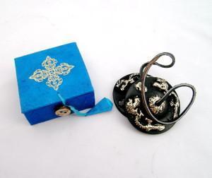 This little lokta box holds a 2 inch set of tingshas. The design on the tingshas is a golden dragon. The carving is rustic and hand cast. LAST ONE