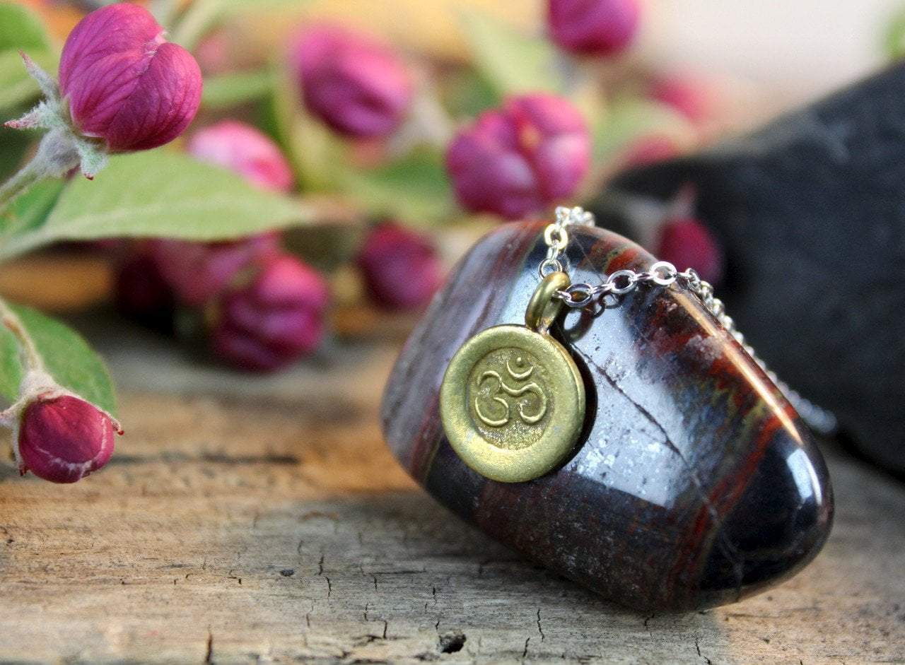 Tiny brass Om charm on a sterling silver 18 inch flat chain. The perfect gift for you or for someone special.
