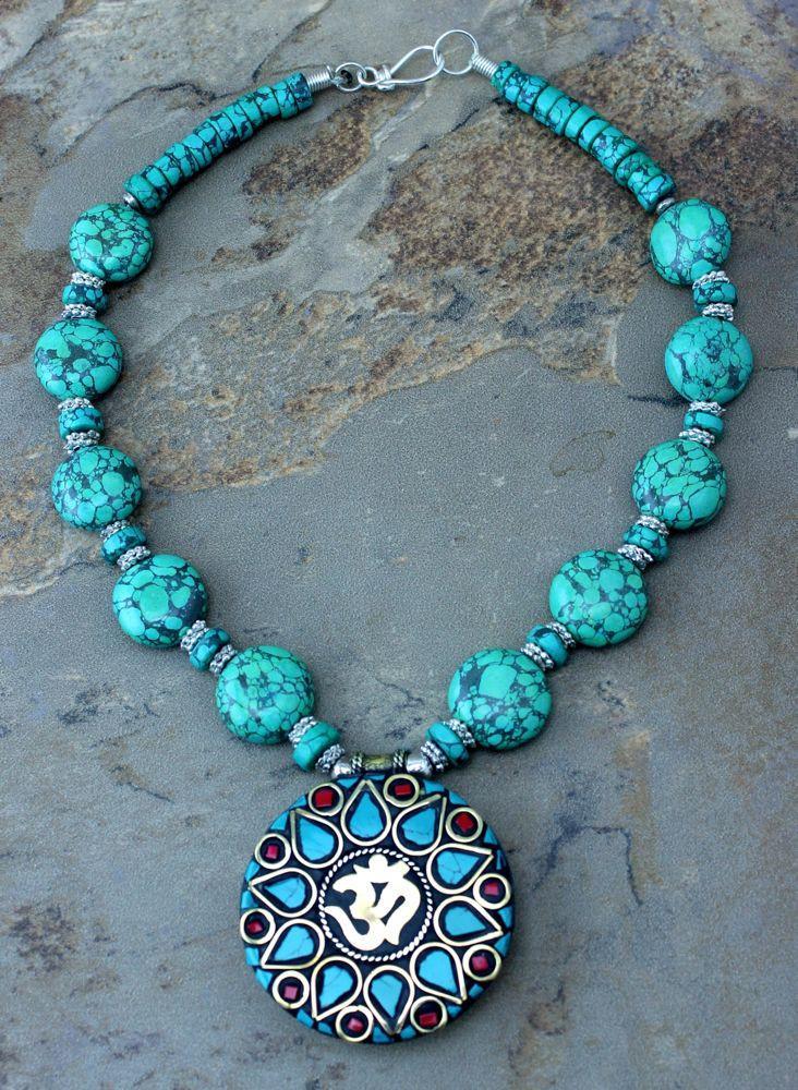 Traditional Style Turquoise necklace with pressed turquoise beads and white metal spacers and a large brass focal pendant with coral, turquoise and a brass OM.