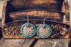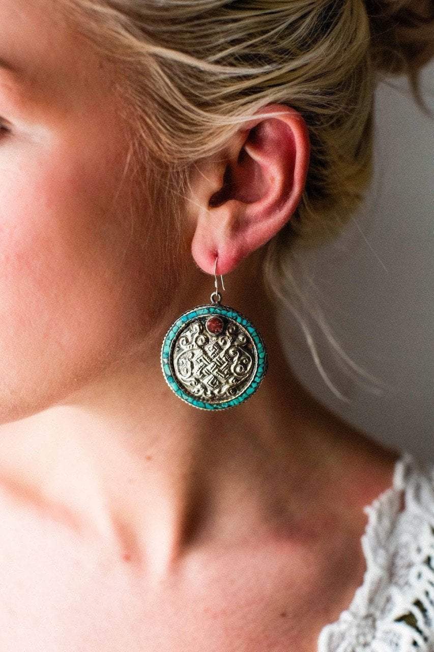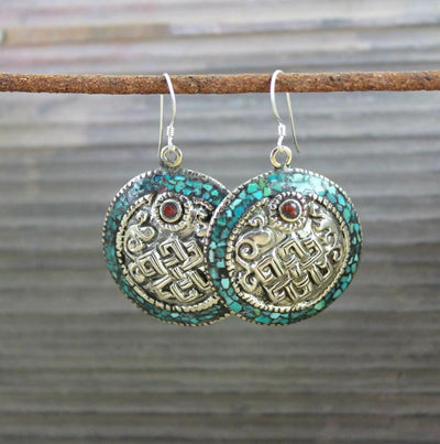 These large, 1-inch earrings are handmade in Kathmandu, Nepal.  Traditional turquoise and coral beads are set in this hand-carved eternal knot earring set.