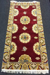 this rug is a traditional pattern and is one of a kind. 100 knots per square inch, Tibetan and new zealand wool mix with silk details. 35 by 71 inches (approx 3 by 6 feet)