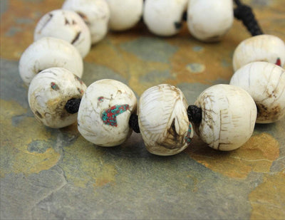 Adjustable, hand knotted naga shell bracelet with traditional naga shell beads inlaid with turquoise and coral stones. The beads come from Nagaland and are inlaid in Nepal.