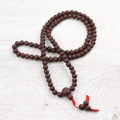• Made of 108 small, well used dark bodhi beads.  Each bead is rich in color with a beautiful sheen as well as its own shape and texture.  Mala has been restrung in recent years on bold red cord in a unique fashion with 3 antique bodhi accents.