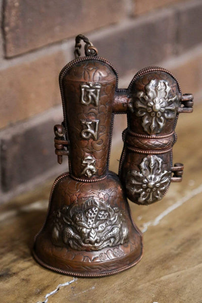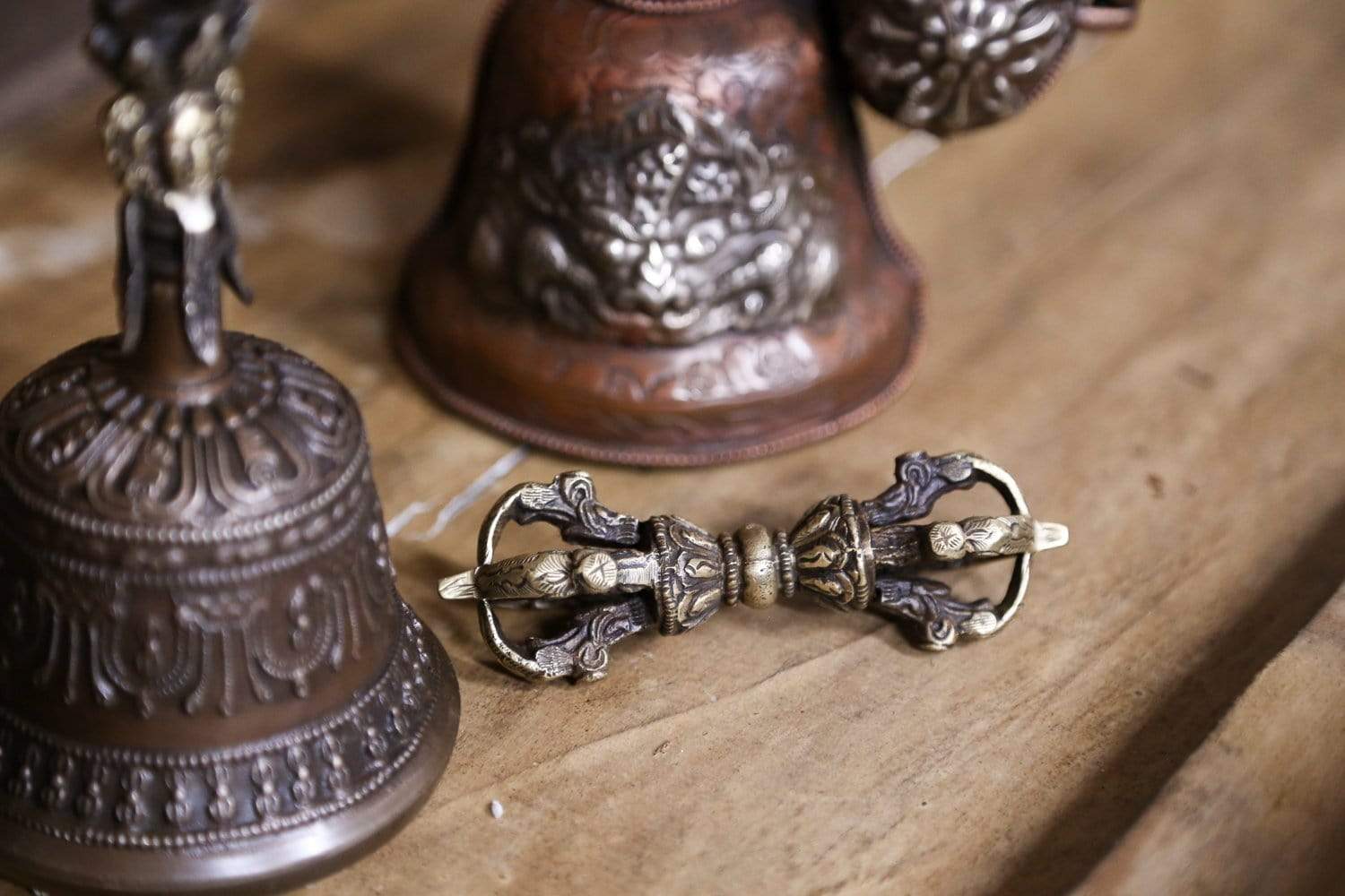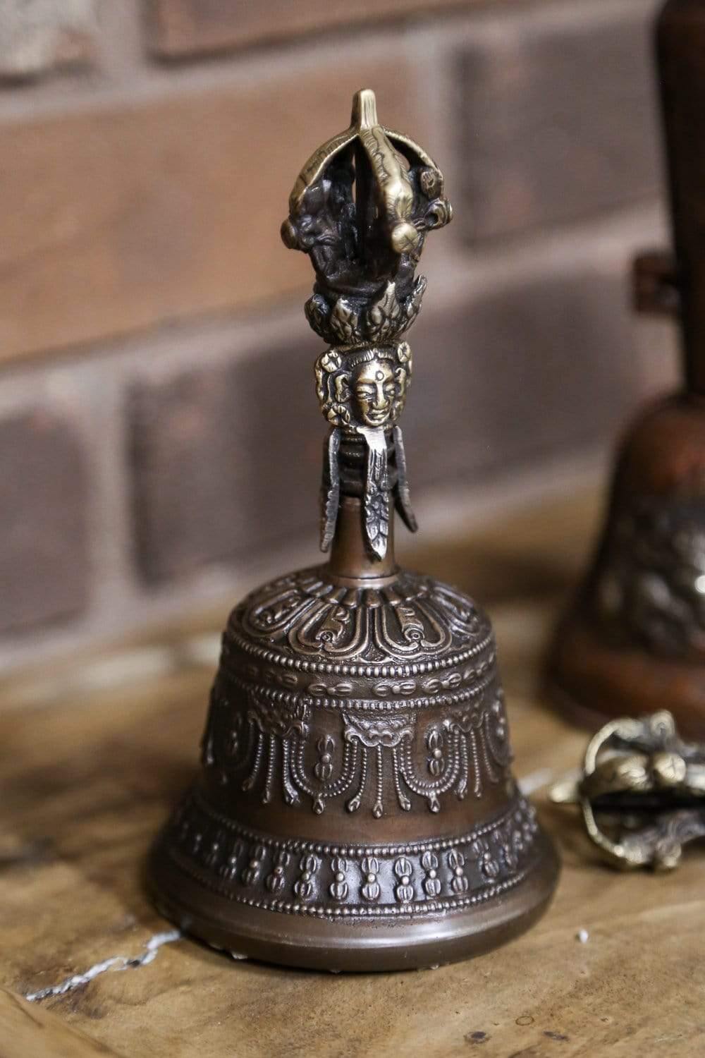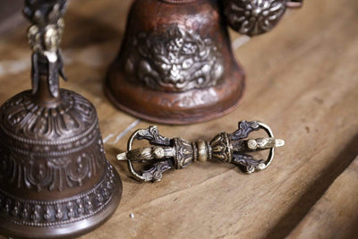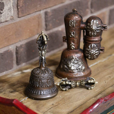 The hollow of the bell symbolizes the wisdom cognizing emptiness. The clapper represents the sound of emptiness. The eight lotus petals on the bell are the four mothers and four goddesses, and the vase represents the vase containing the nectar of accomplishment. Paired with the dorje, the bell represents wisdom. As wisdom and method are an undivided unity, so the dorje and bell are never parted or employed separately.