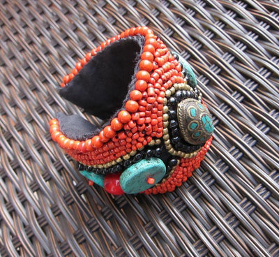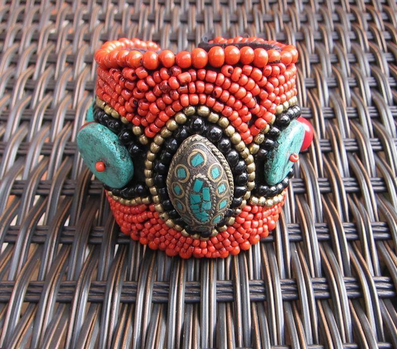 I love these handmade bracelets. They are flexable so they are easy to take off and put on. Hand made with faux coral and pressed tourquoise beads.