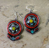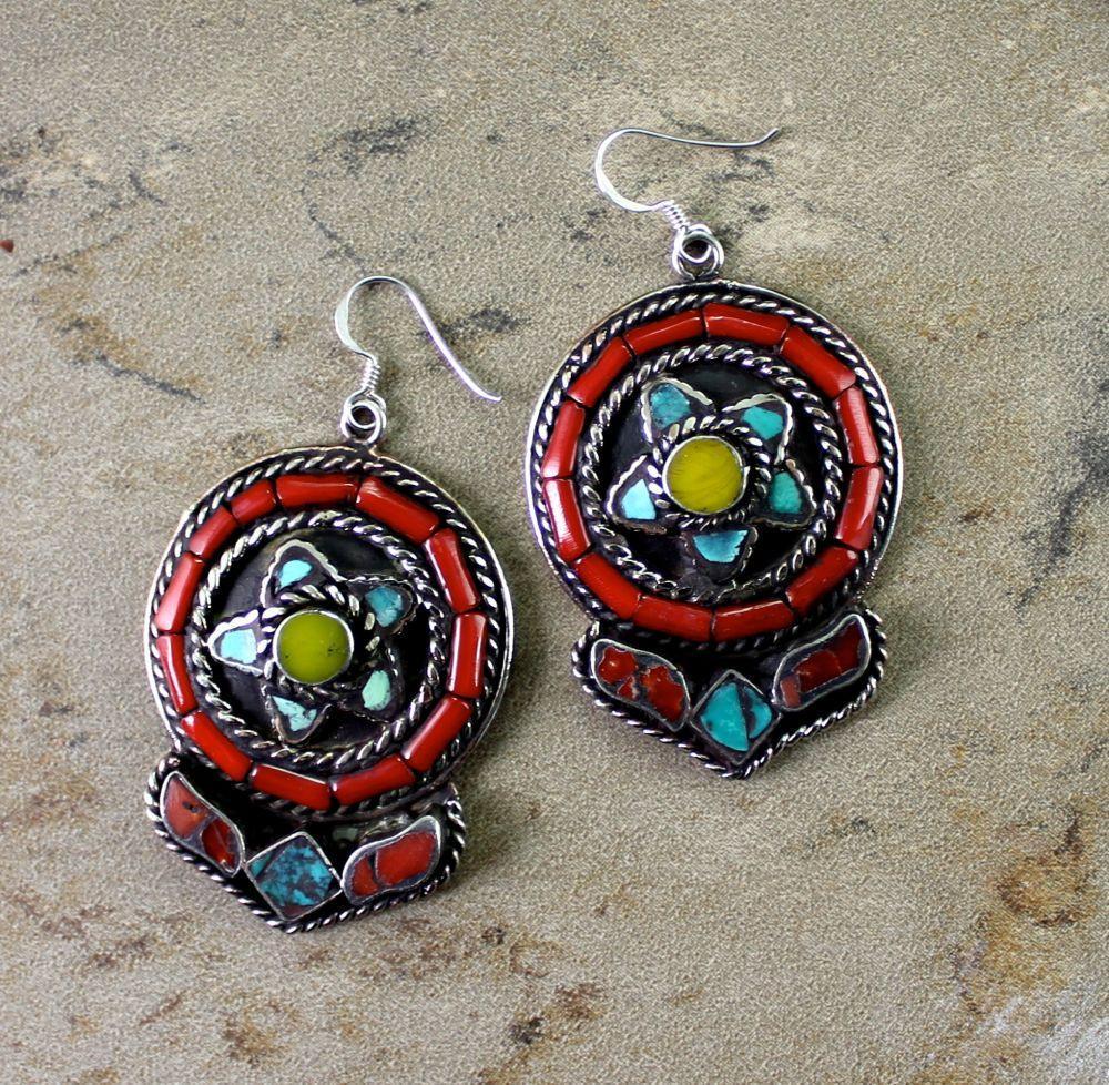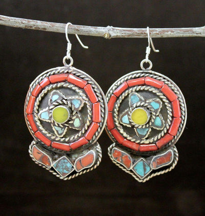 These brilliant Tibetan earrings are hand made in Patan, Nepal. Traditional Tibetan styling with coral, turquoise, and copal beads set in silver plated brass.