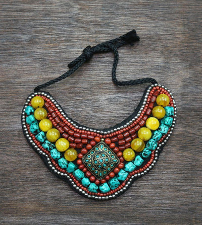 These traditional necklaces are making a comeback in Tibetan communities around the world. Ancient versions of these necklaces had thousands of dollars worth of trade beads, our modern version is all hand made in Nepal with faux coral beads and pressed tourquoisewith copal amber. One of a kind