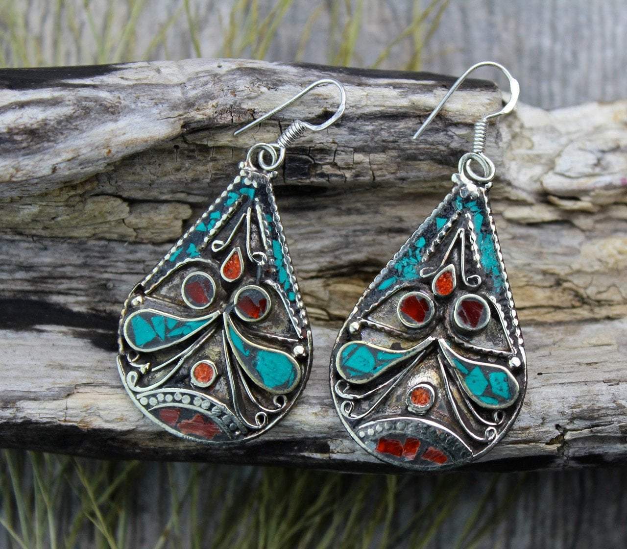 Beautiful traditional Tibetan designed earrings in a teardrop shape. Silver-plated brass inlaid with turquoise, coral, and copal.