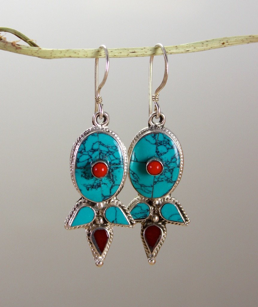 A beautiful and simple Tibetan style set of earrings. We used silver plated brass to keep the cost down. Hand set in Kathmandu