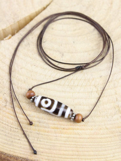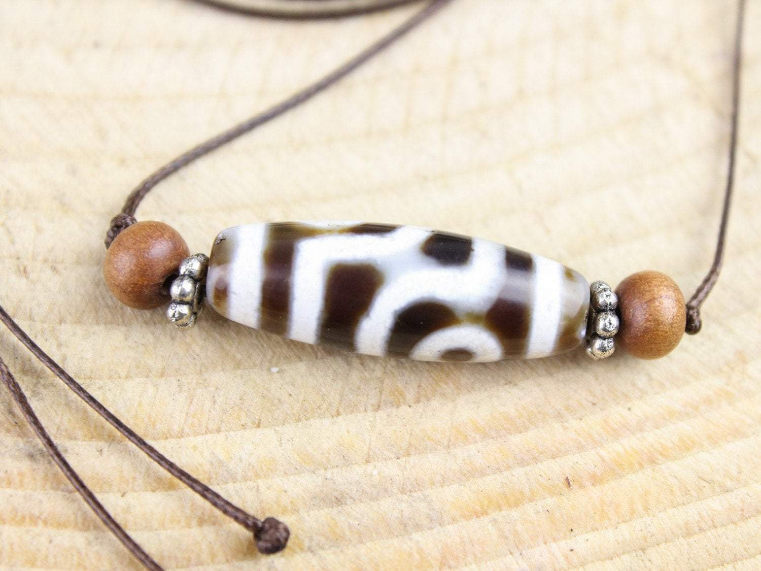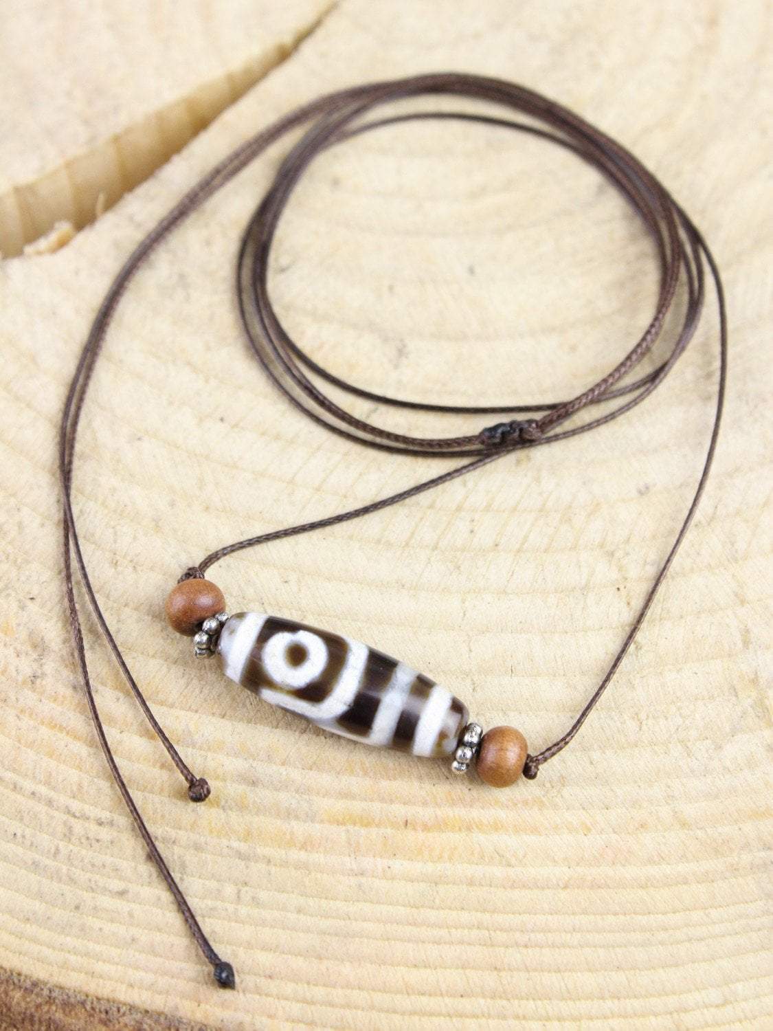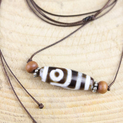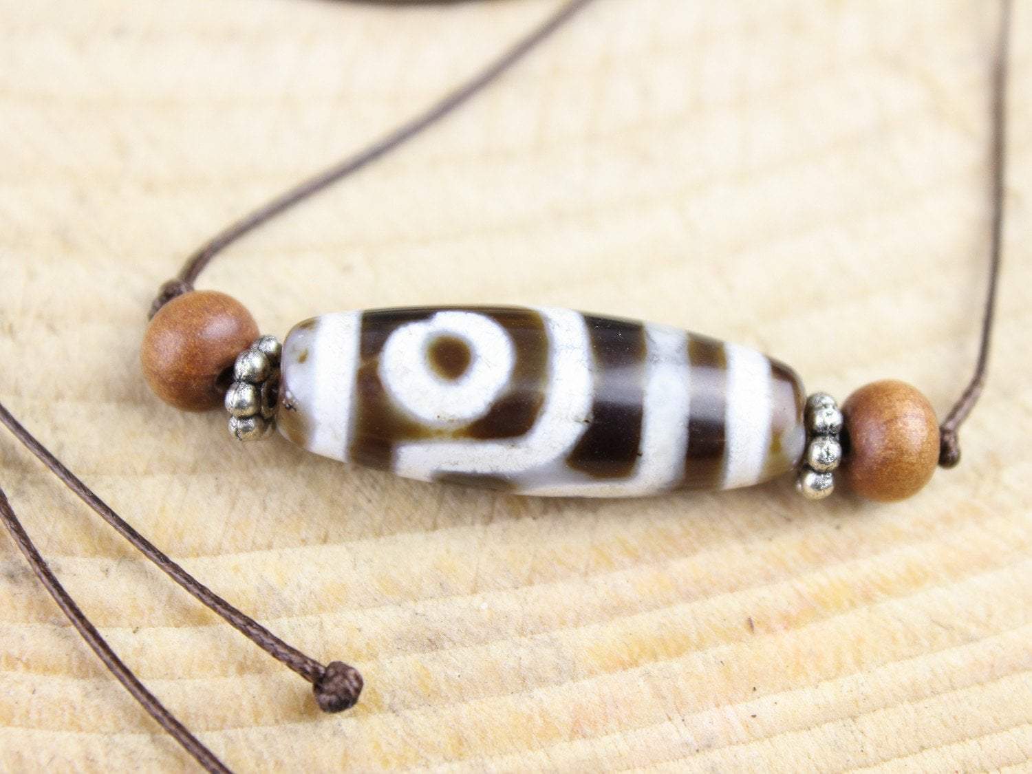 Each necklace is hand strung right here at the DharmaShop with Dzi beads collected in the last 17 yearsfrom Kathmandu, Nepal. As each bead is handmade, size or details may vary marginally - please let us choose. Limited quantity; only two available. Necklace features a double eyed Dzi with sandalwood accents on vegan leather cord.