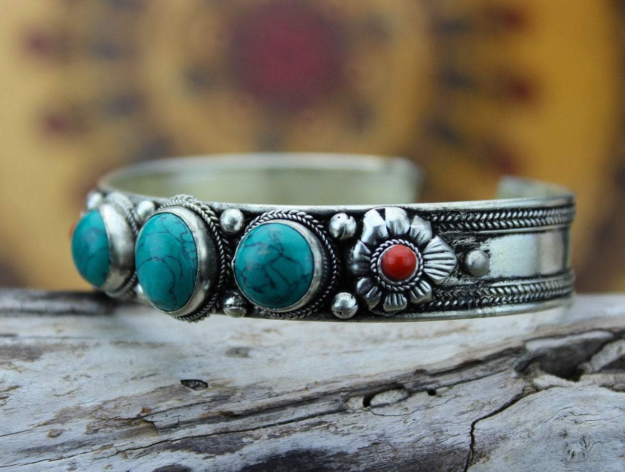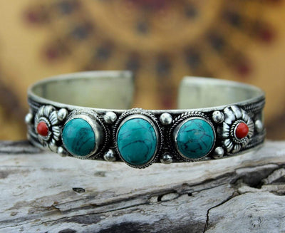 Handmade, silver plated with turquoise and coral stones bracelet.
