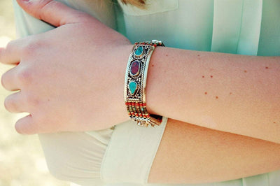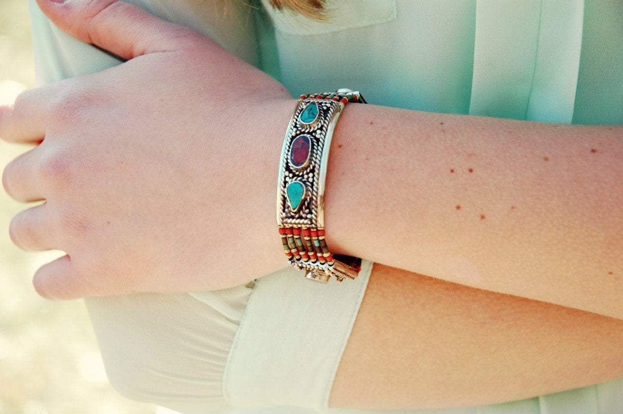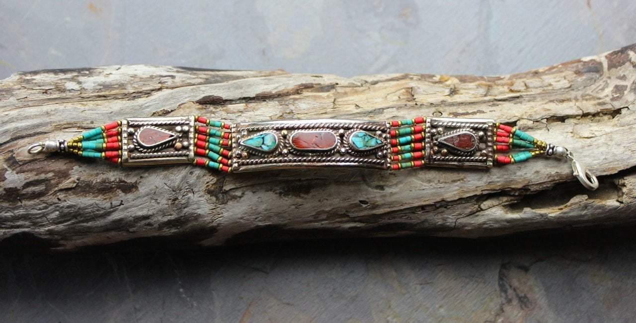 Hand made in Kathmandu Nepal. Turquoise, coral and silver bracelet.