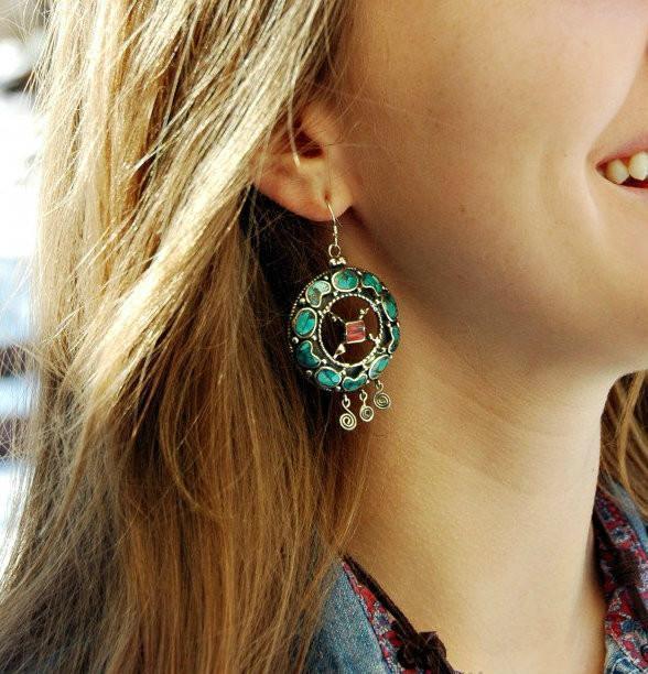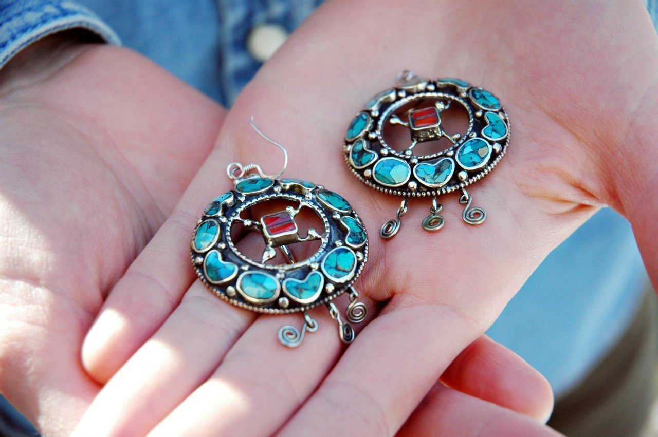 Beautiful traditional handcrafted silver earrings inlaid with turquoise and coral.  Handmade in Kathmandu, Nepal.