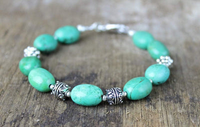 Turquoise beads with a variety of silver spacers and a lobster claw clasp.