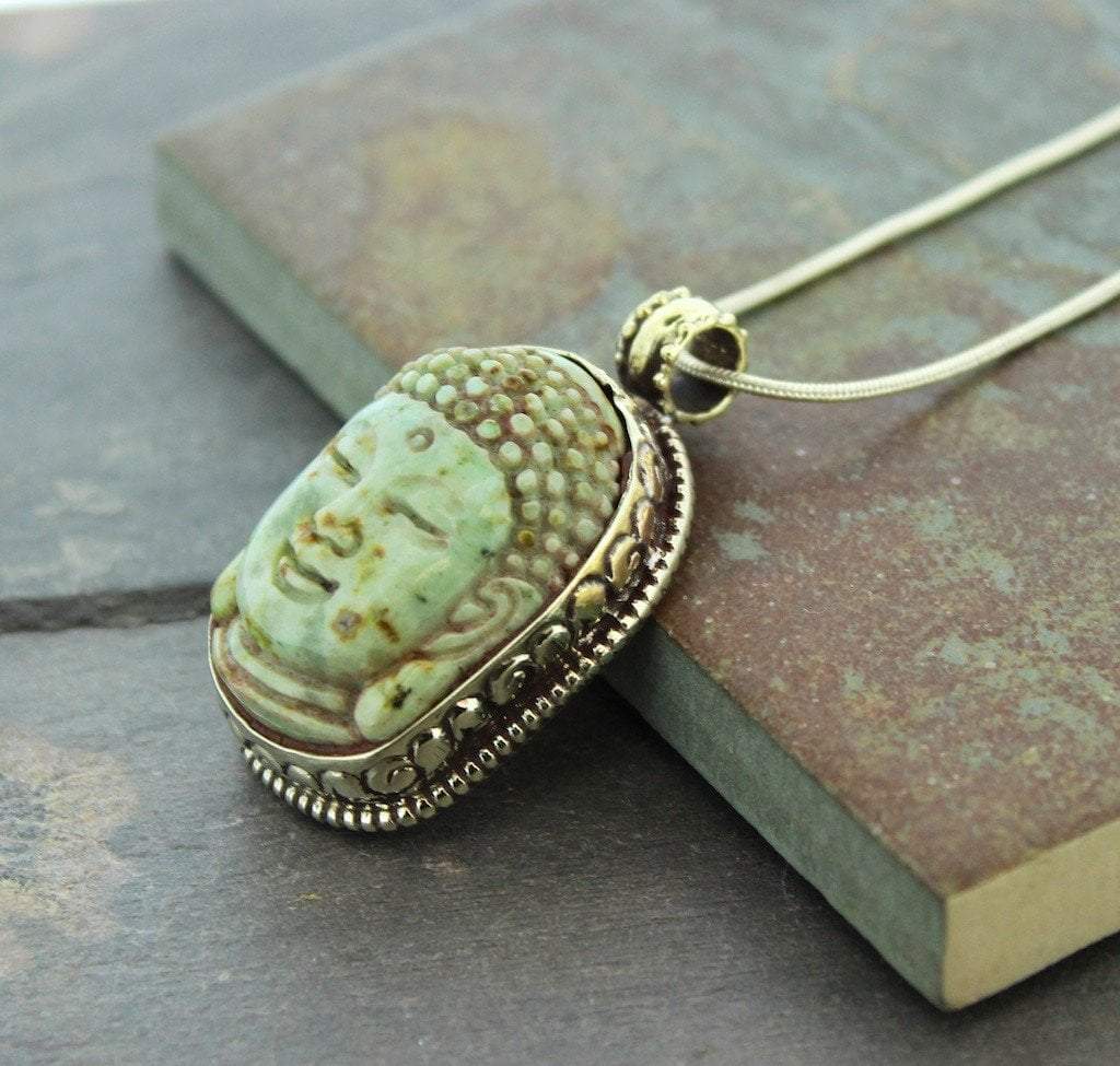 These hand carved Buddha head pendants are made with stabalised turquoise and set in silver setting in Kathmandu nepal