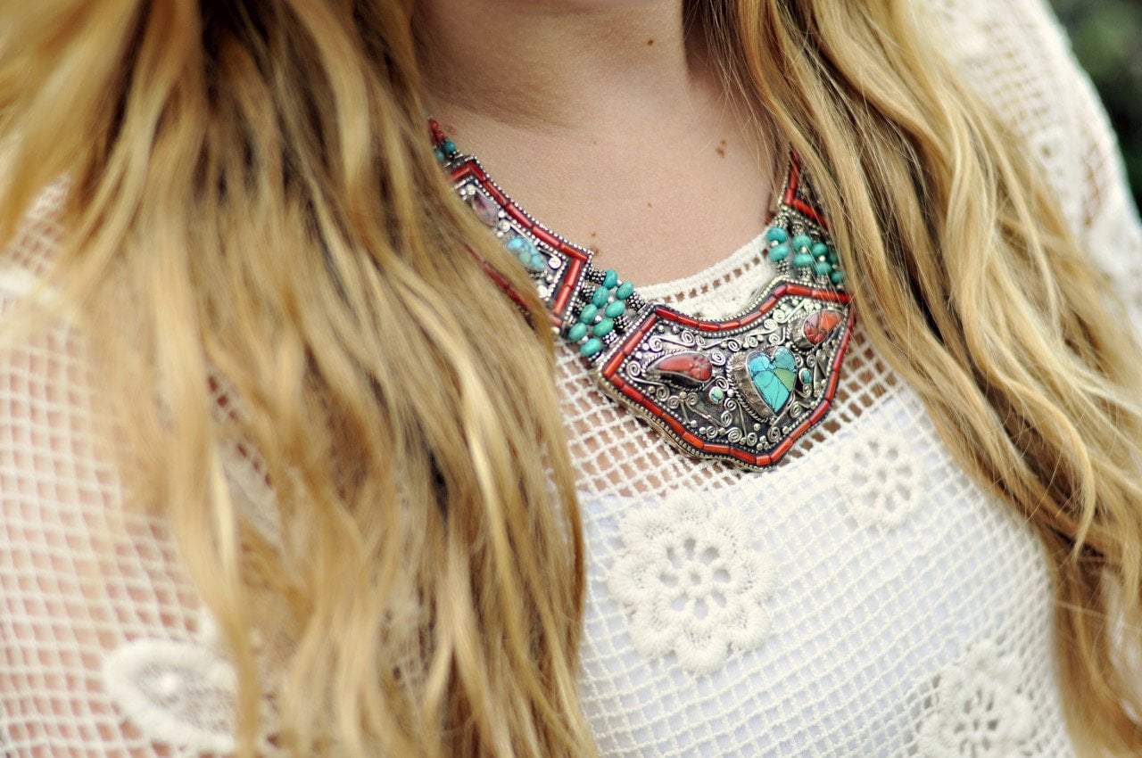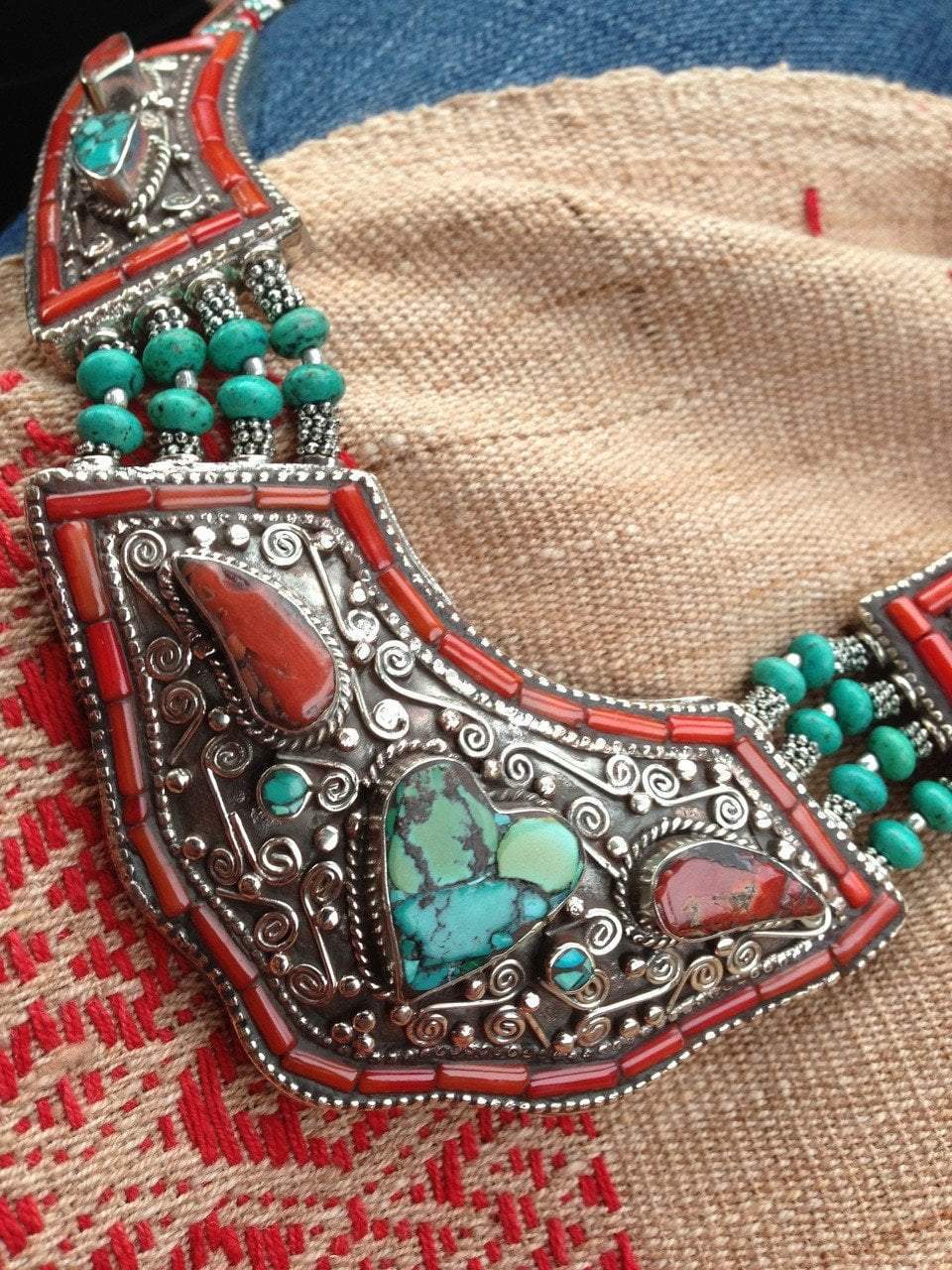 This Tibetan necklace is truly unique! It features a beautiful heart shaped turquoise piece at its center and is surrounded by deep coral. Accented with strands of turquoise and other inlaid silver plated brass pieces.