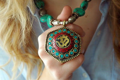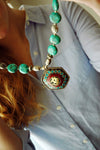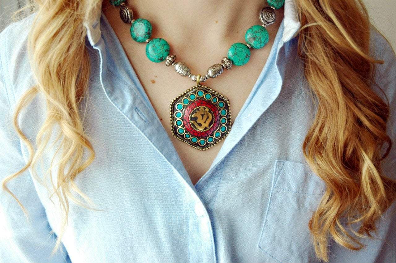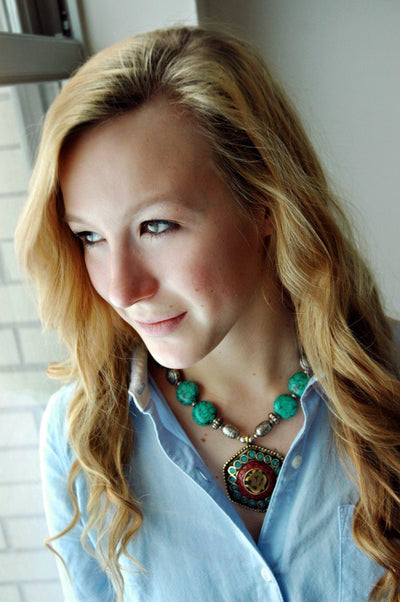 Turquoise bead necklace with hexagon shaped pendant. Hand made in Kathmand Nepal.