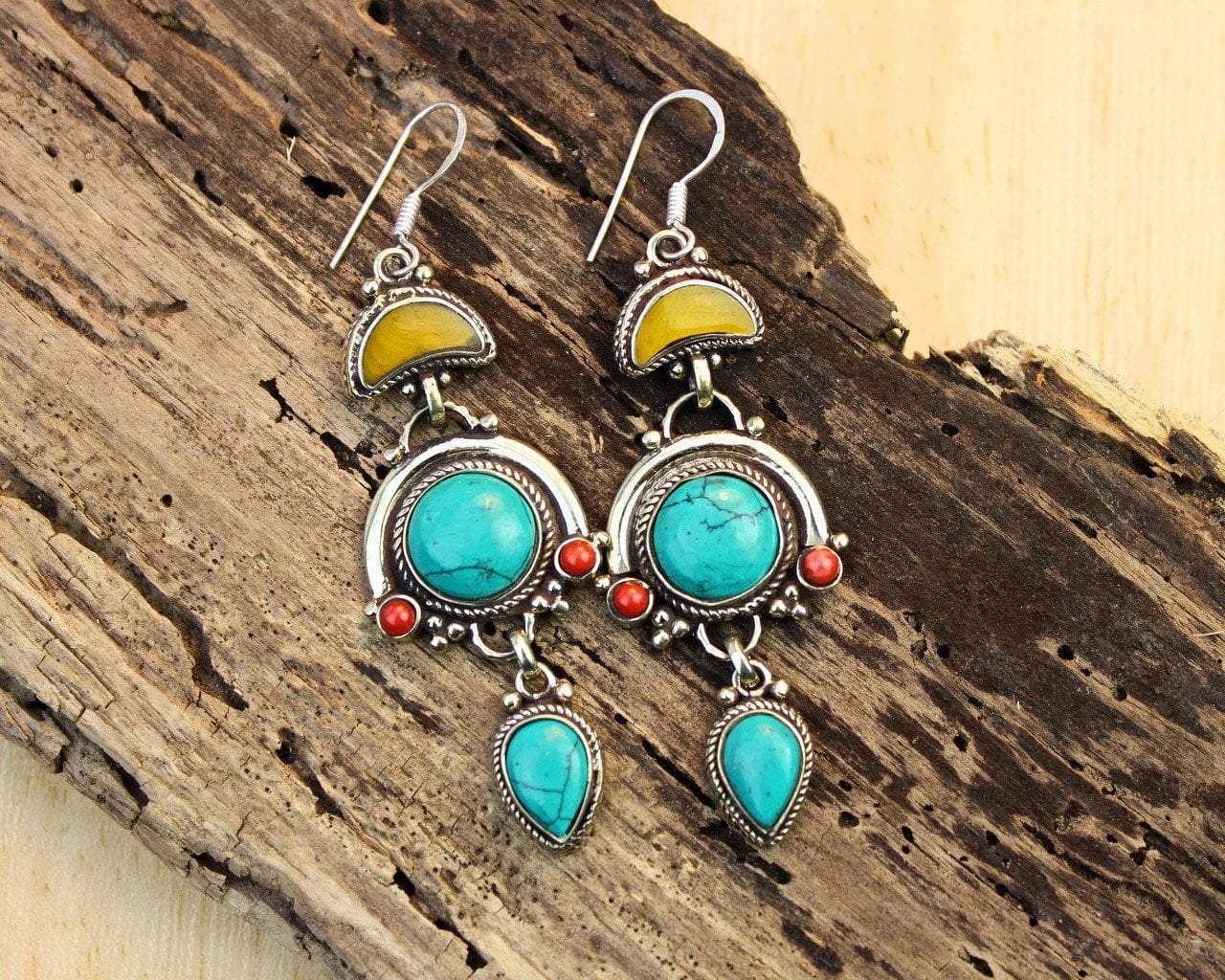 Turquoise, amber and coral hand set in silver plated brass with sterling silver french hooks. Handmade in Kathmandu, Nepal.