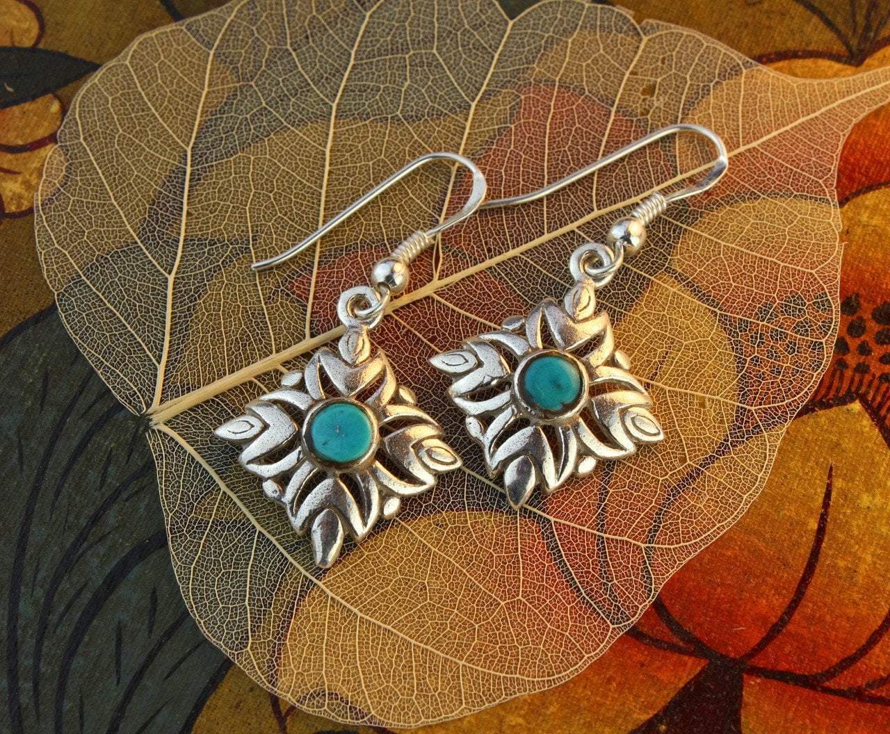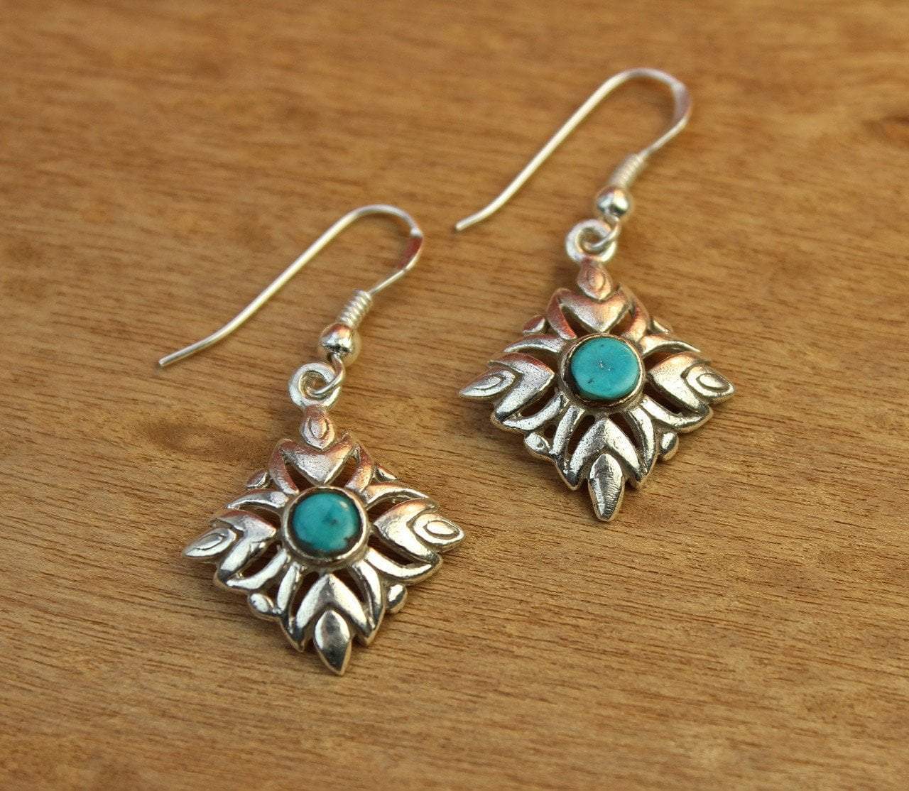 Simple and beautiful sterling silver mandala earrings with a turquoise stone set in the middle.