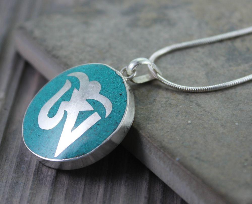 Our newest Tibetan Om pendant. A large careved chunk of reconstituted turquoise set in silver plated brass pendant with a sterling silver OM design.