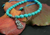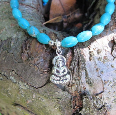4 mm turquoise beads strung on turquoise cord with buddha charm. Adjusts using a beautifully tied sliding knot. Handmade by Tibetan artisans. Size:Adjustable