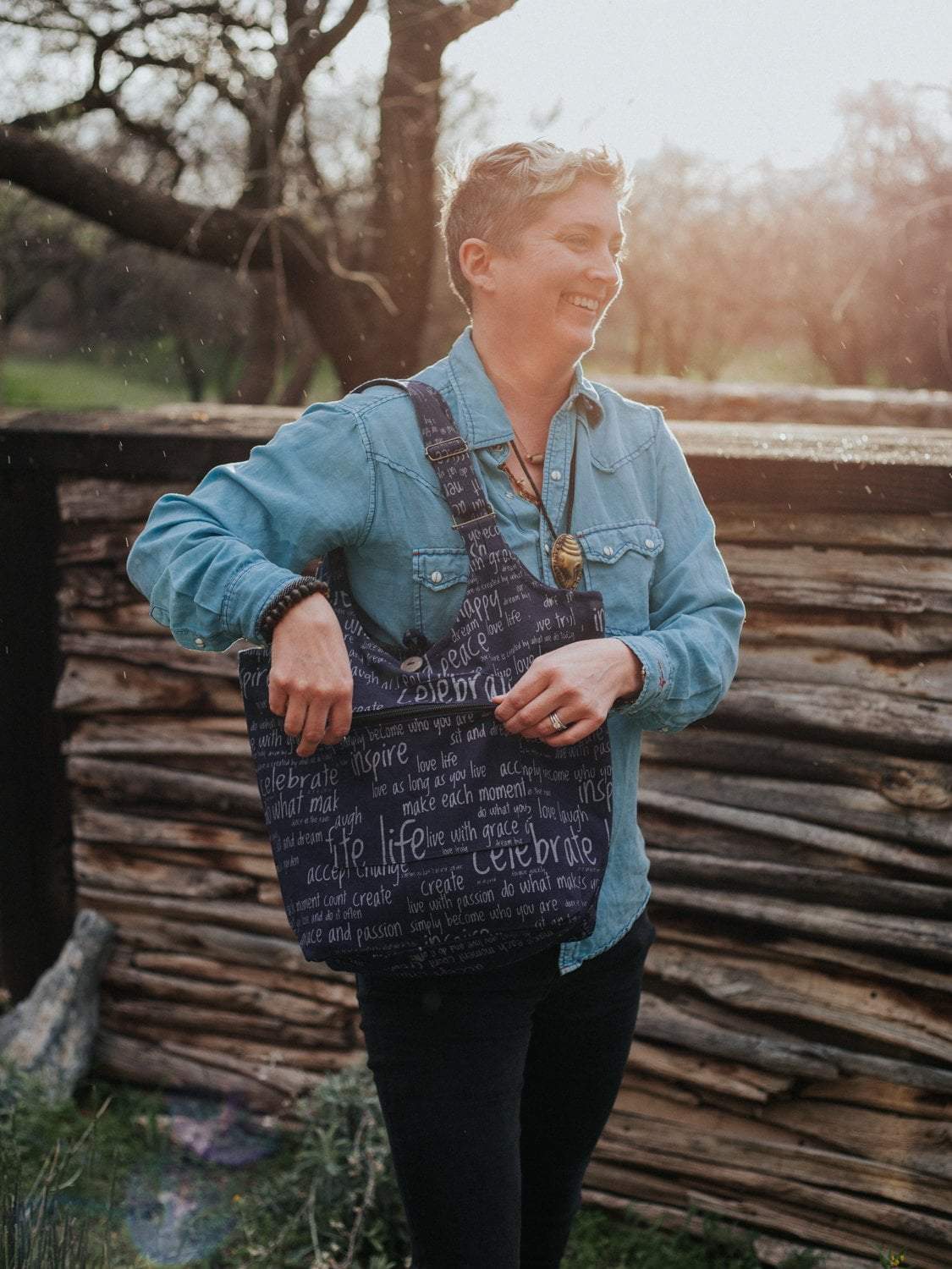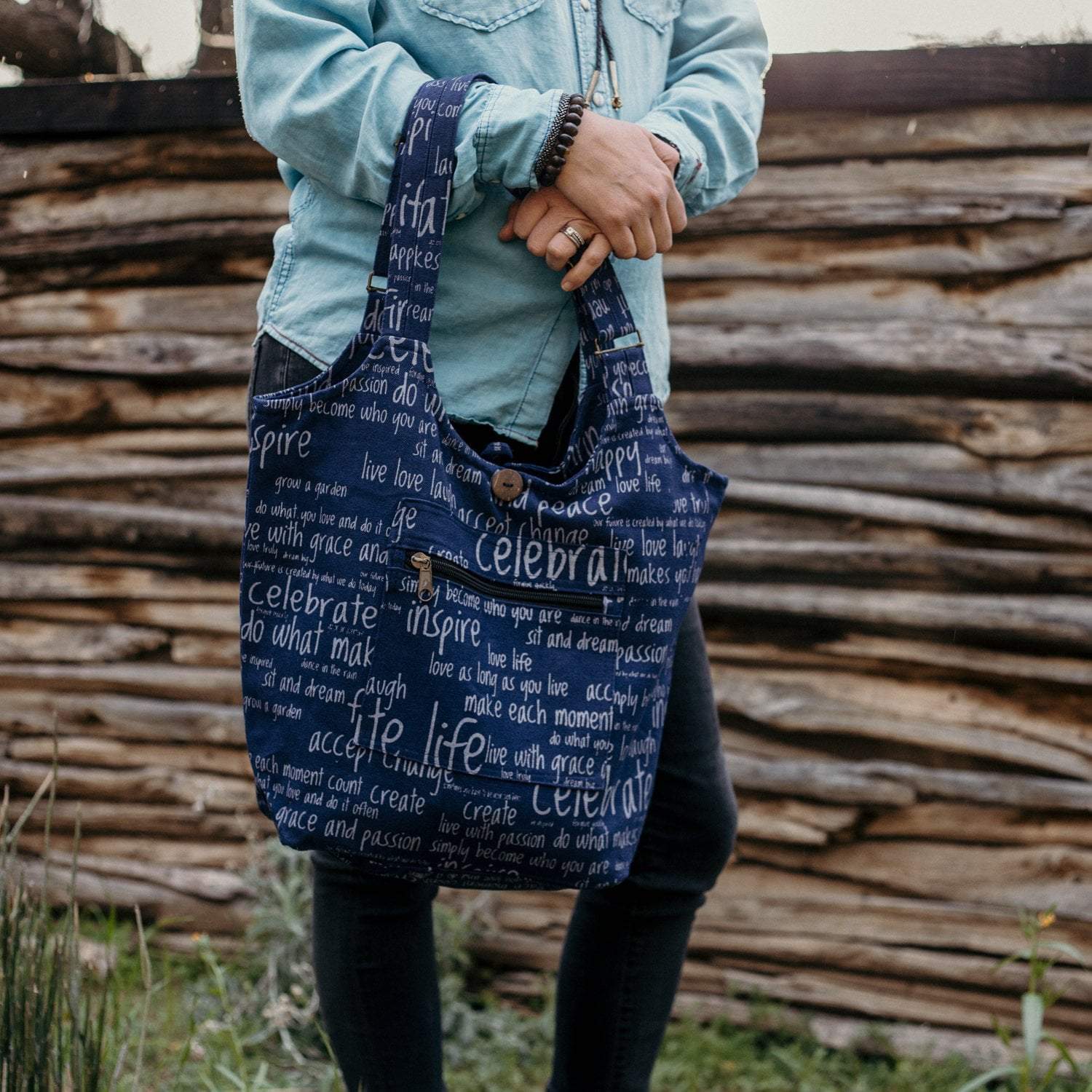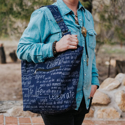 This handmade tote bag is excellent for carrying just about anything including your books, laptop, or day to day essentials.  It's the perfect size bag with a great adjustable strap drop length for easy carrying.  Made with 100% cotton in Nepal.  The outside of the bag is printed with uplifting words and phrases including: peace, inspire, dream big, do what you love, live with passion, and much more!  There is a zipper pocket on the outside of the bag as well as one on the inside, which is lined with black cotton.  Closes with a zipper and button closure.