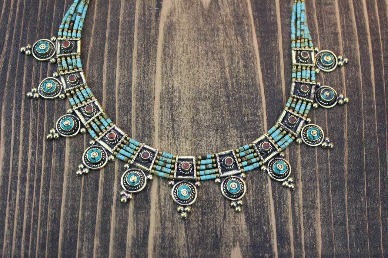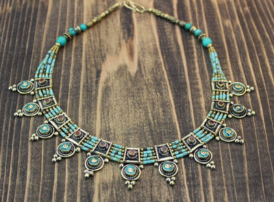 A truly gorgeous statement necklace. Handmade in Nepal, this combination of gold brass, turquoise and hints of coral makes it the perfect accessory.
