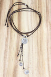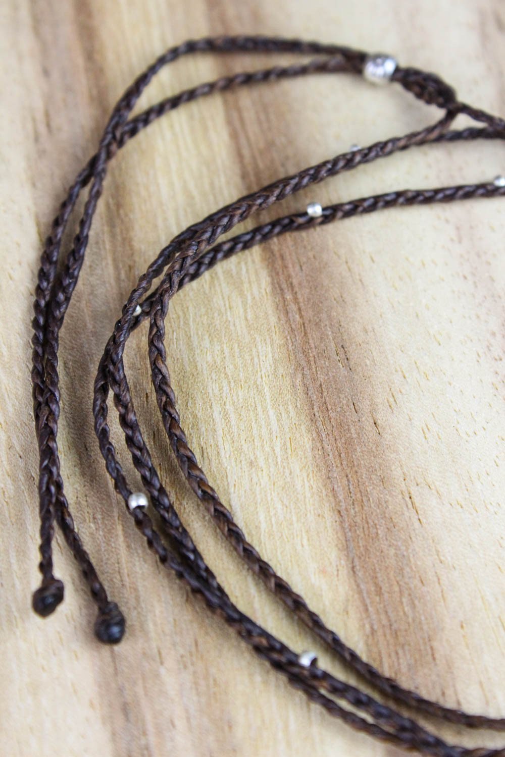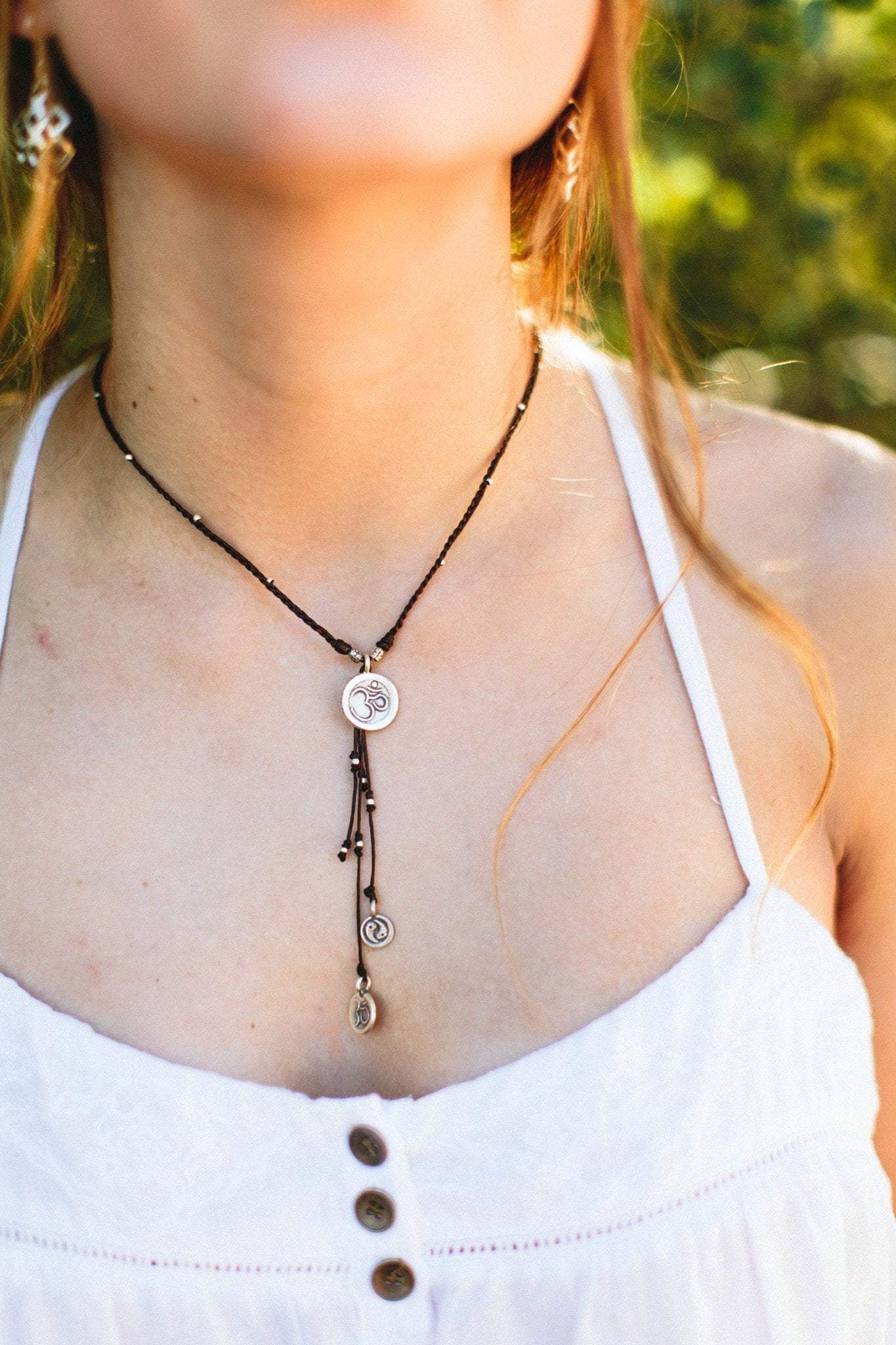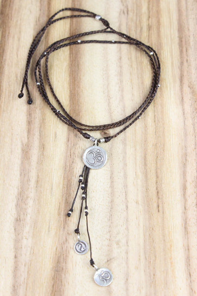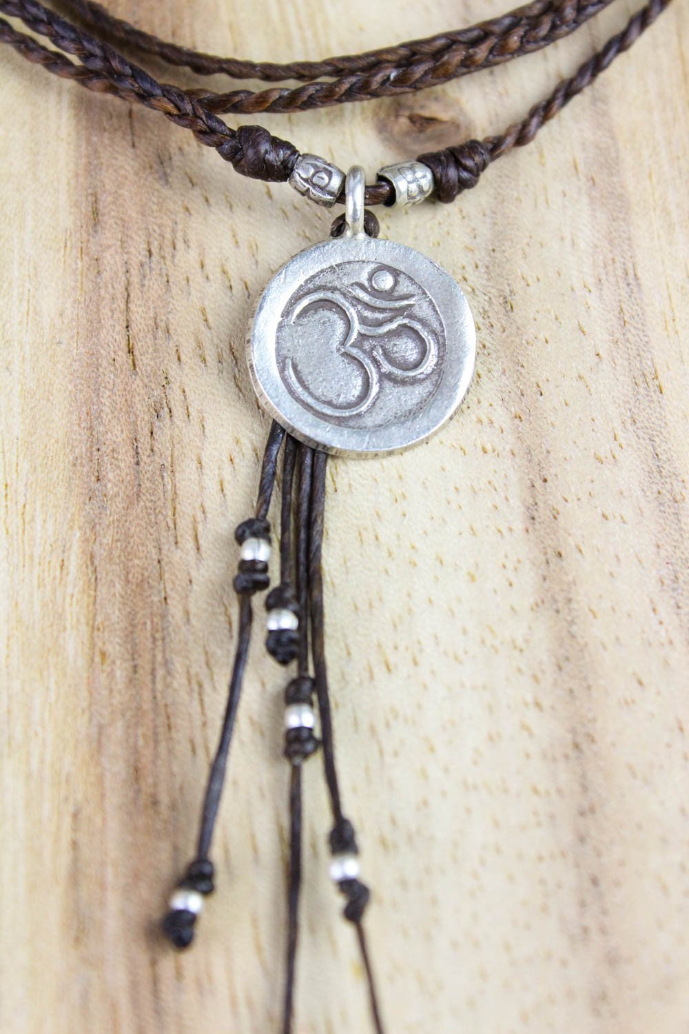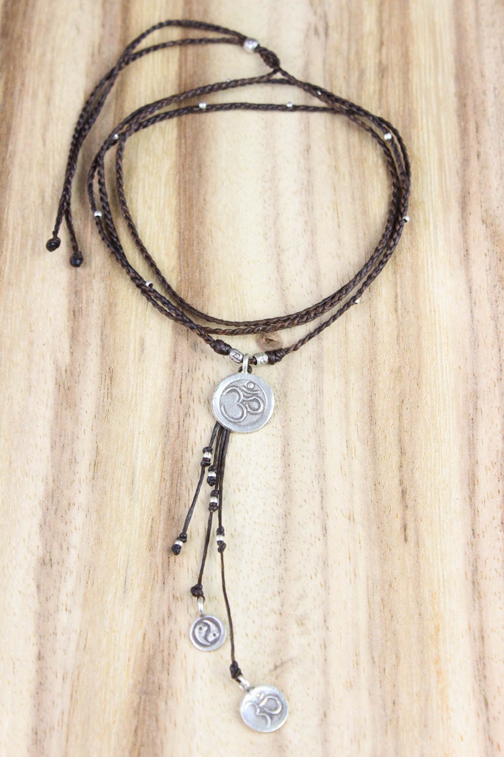 Adjustable necklace includes 98% pure Hill Tribe silver beads that are hand woven on brown waxed cord with a hand-stamped Om charm. The smaller hanging charms differ on every necklace, making each piece completely unique and one-of-a-kind. Can be worn as a necklace, choker, or even a wrapped bracelet.