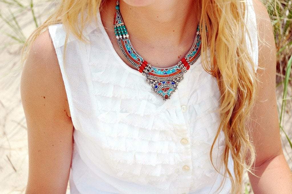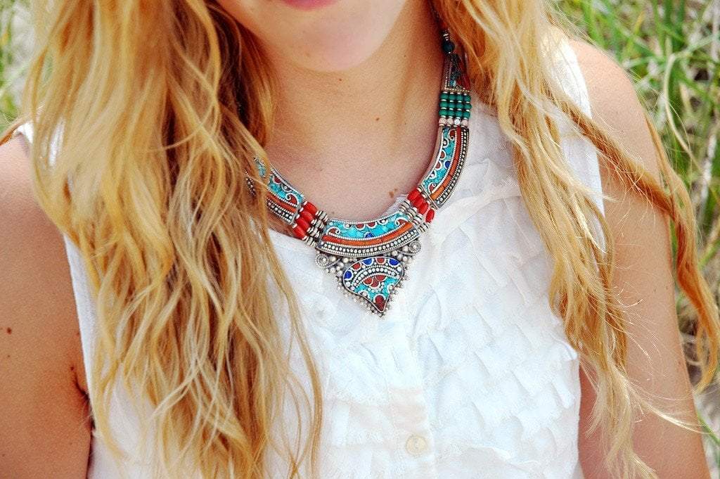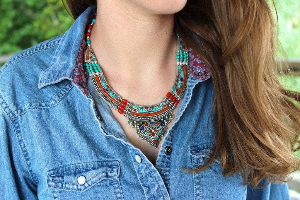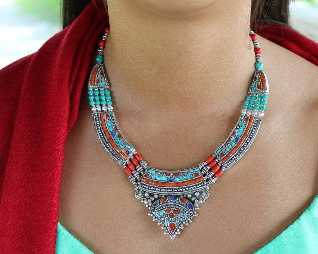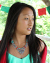 An extraordinary modernized Tibetan necklace with hand inlaid silver, coral, turquoise, and lapis Tibetan beads.
