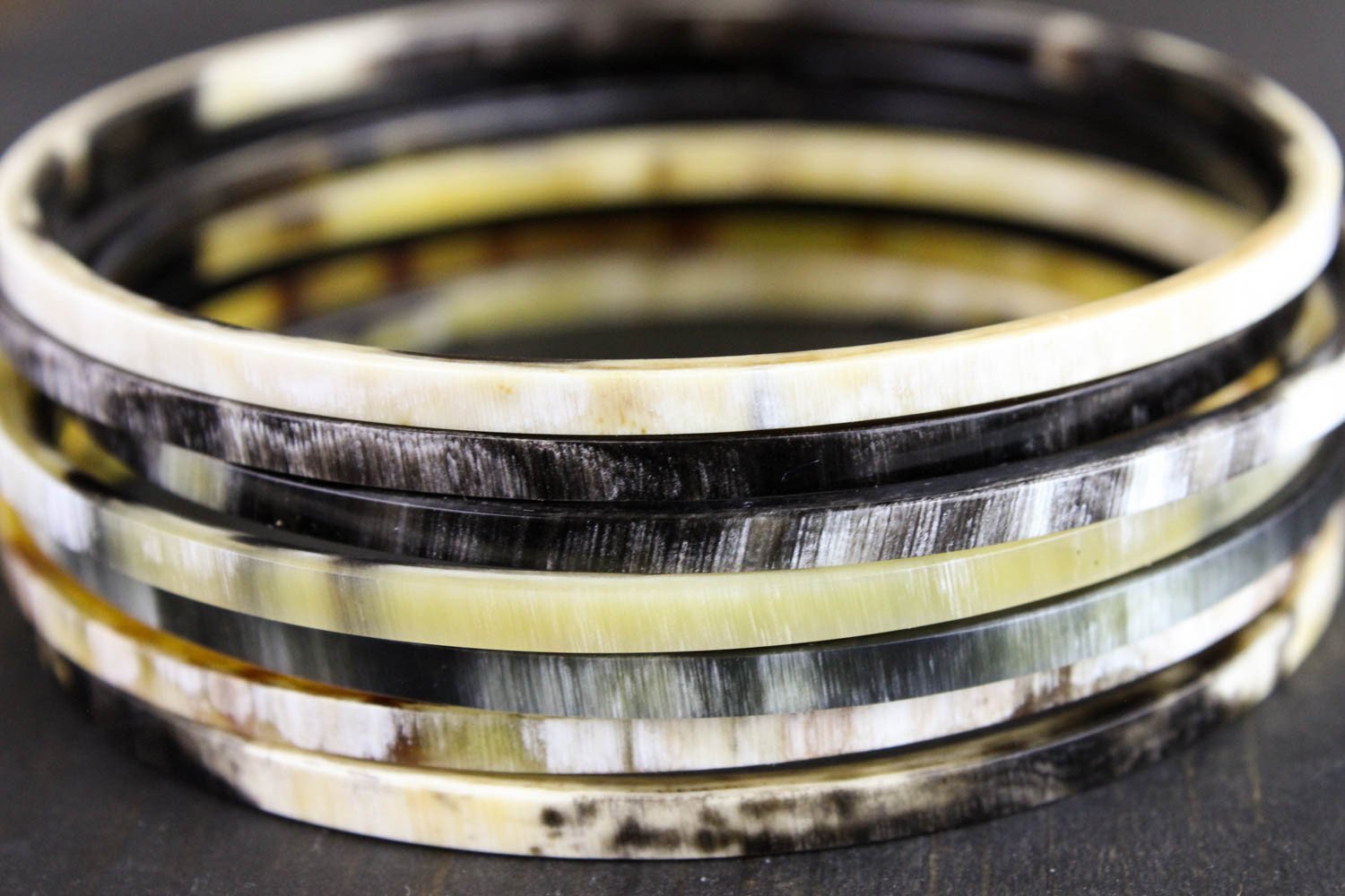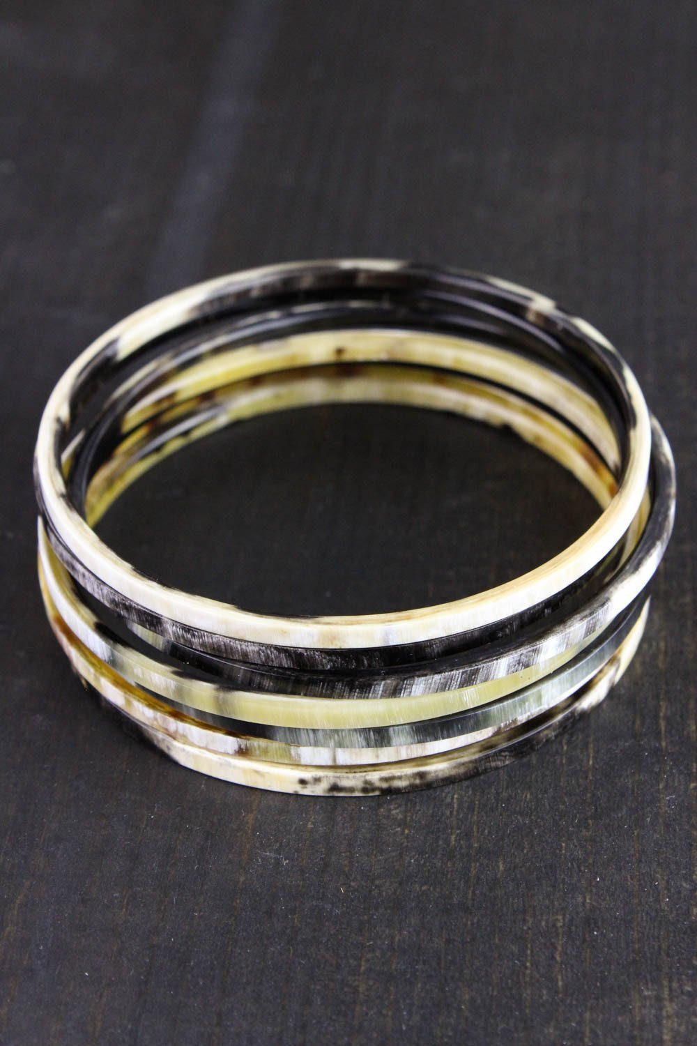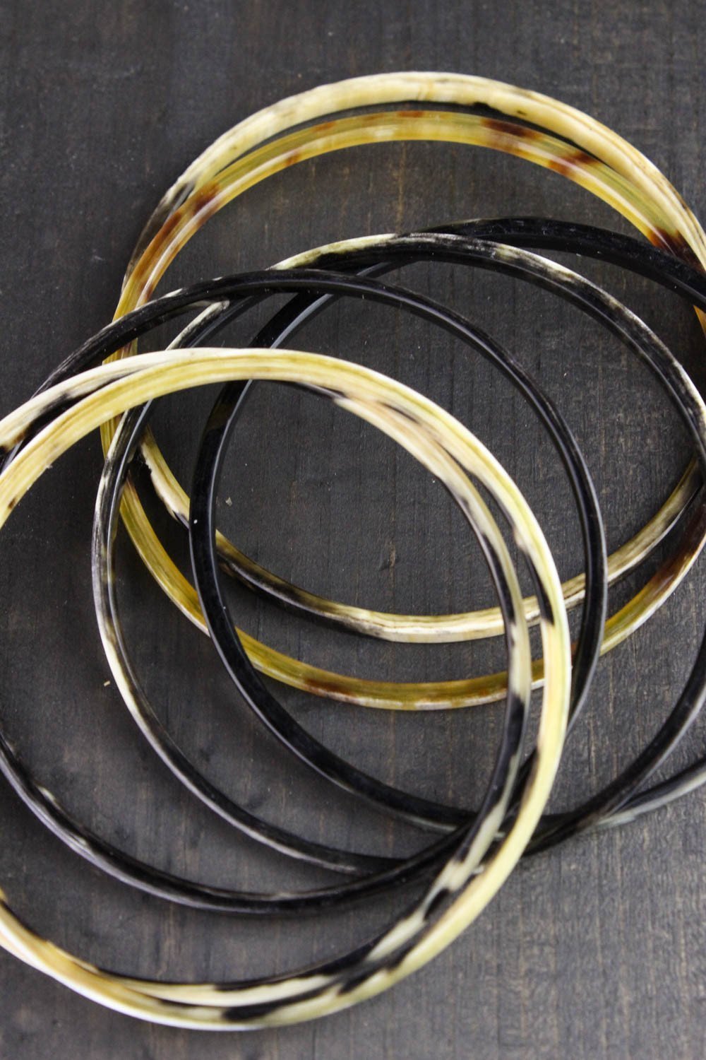 Seven bracelets made from water buffalo horn that can be worn individually or as a stacked set.  Each bracelet has its own unique color and patterns.