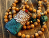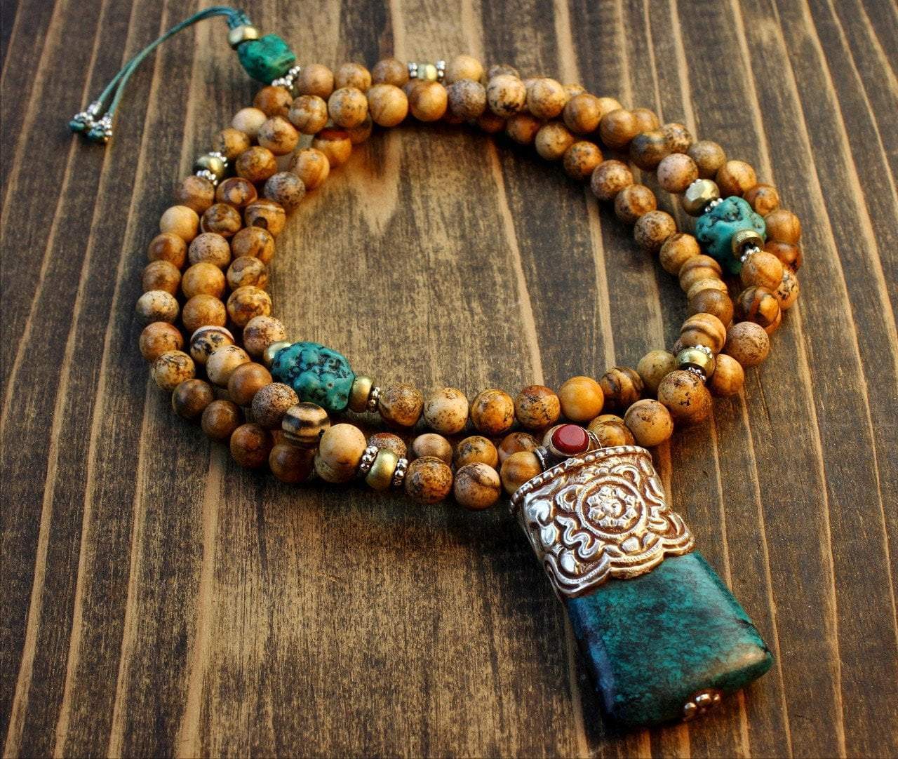One of a kind, 108 picture jasper bead mala with a handmade, traditional Tibetan pendant. The pendant is pressed turquoise and white metal with a Dharma Wheel design.