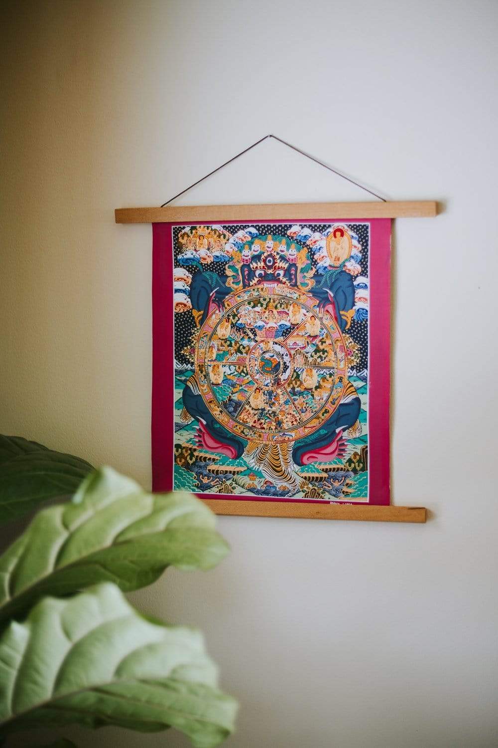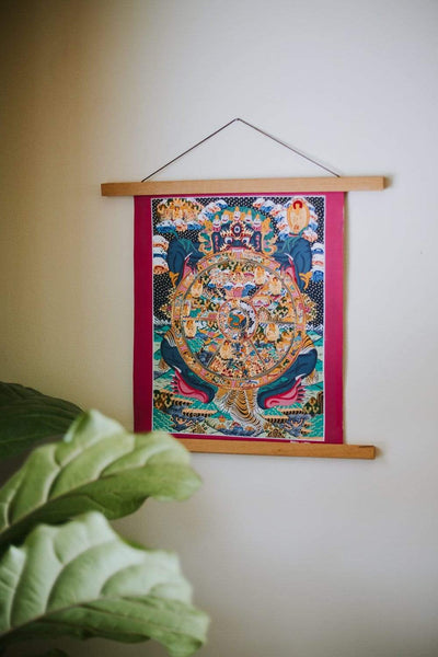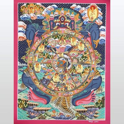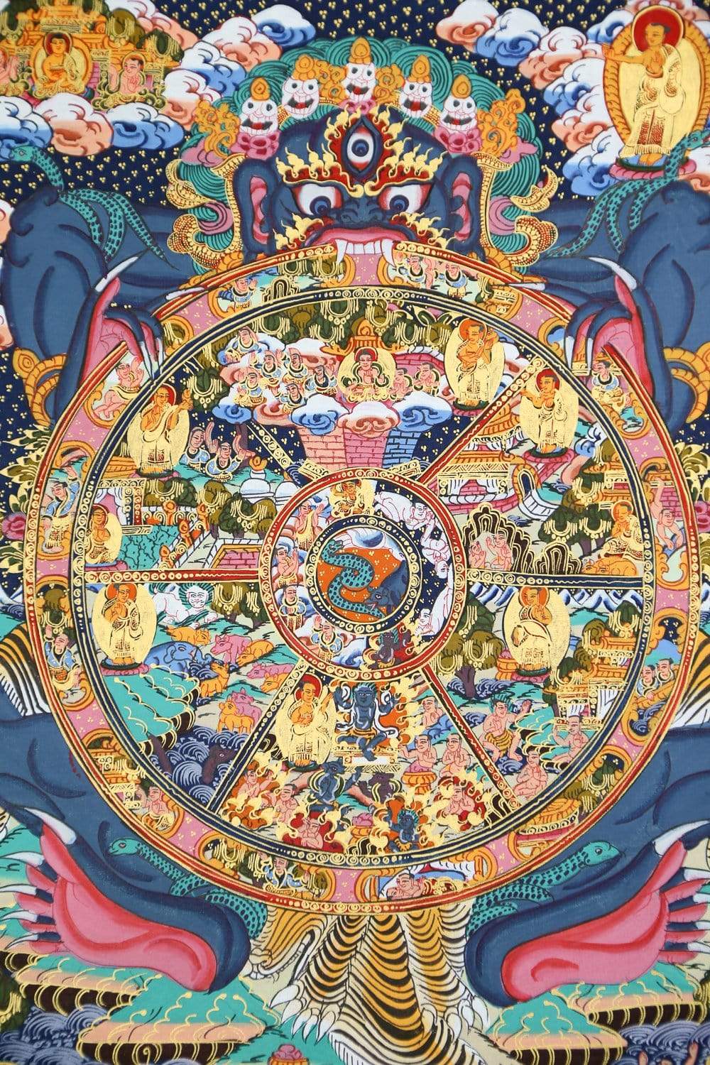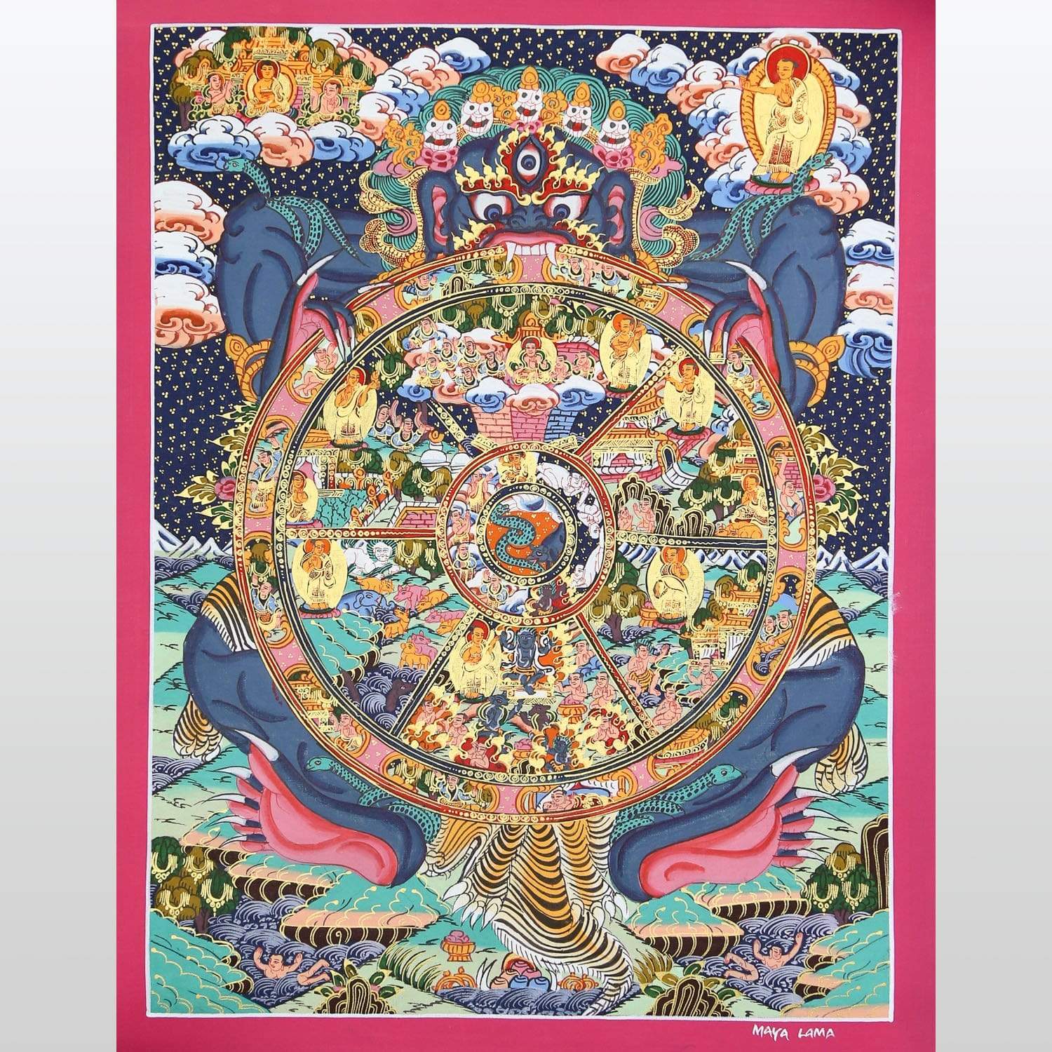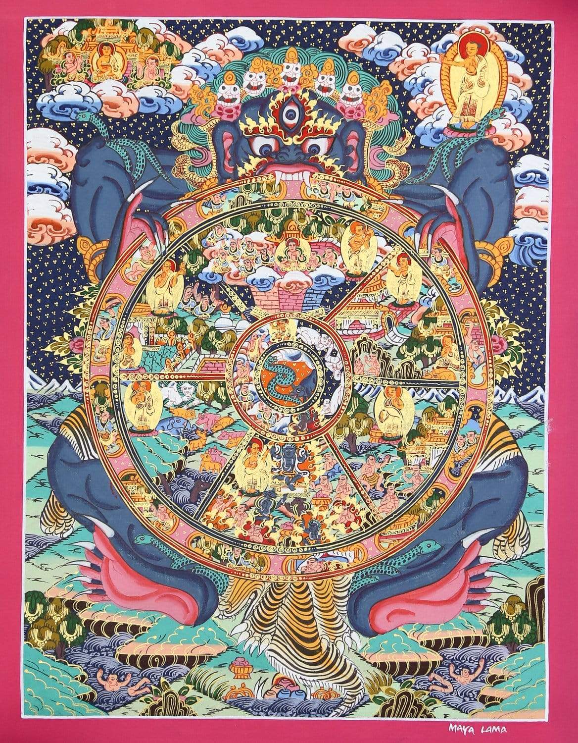 The Wheel of Life is a symbolic representation of samsara and cycle of existence.  It can be found on the outside walls of many Buddhist monasteries and temples to help people understand Buddhist teachings.  The fearsome figure holding the wheel represents impermanence.