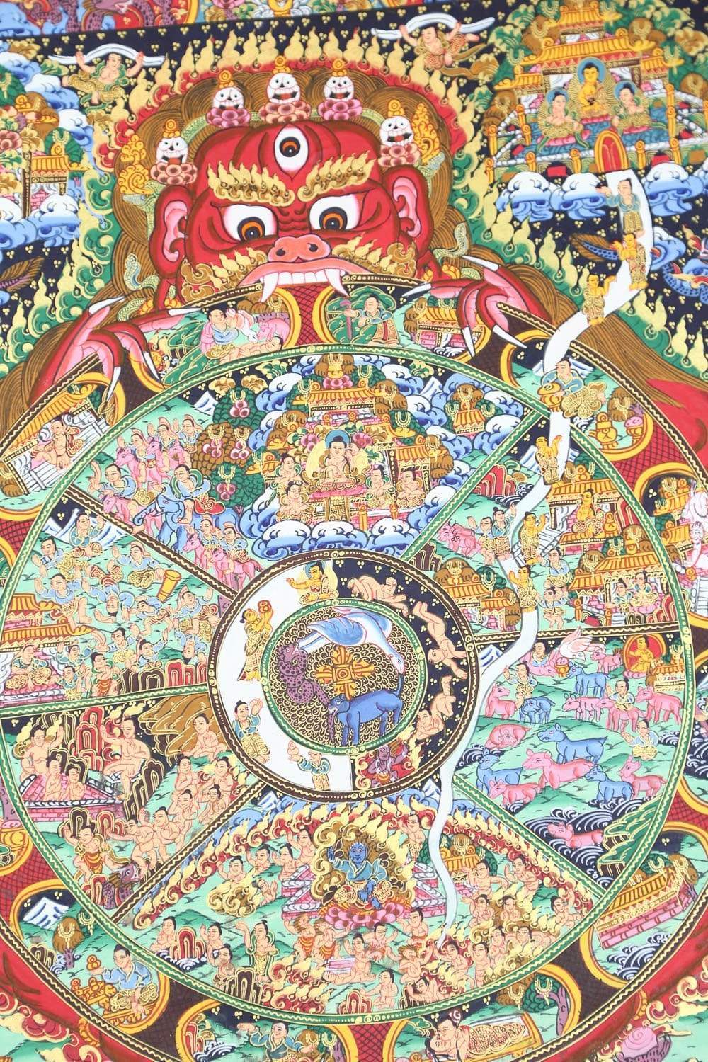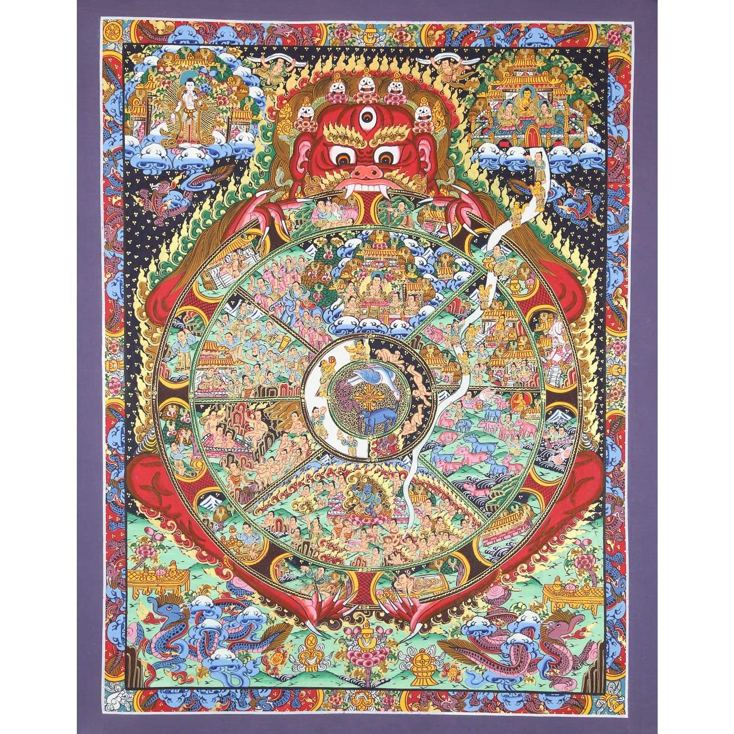 The Wheel of Life is a symbolic representation of samsara and cycle of existence. It can be found on the outside walls of many Buddhist monasteries and temples to help people understand Buddhist teachings. The fearsome figure holding the wheel represents impermanence.