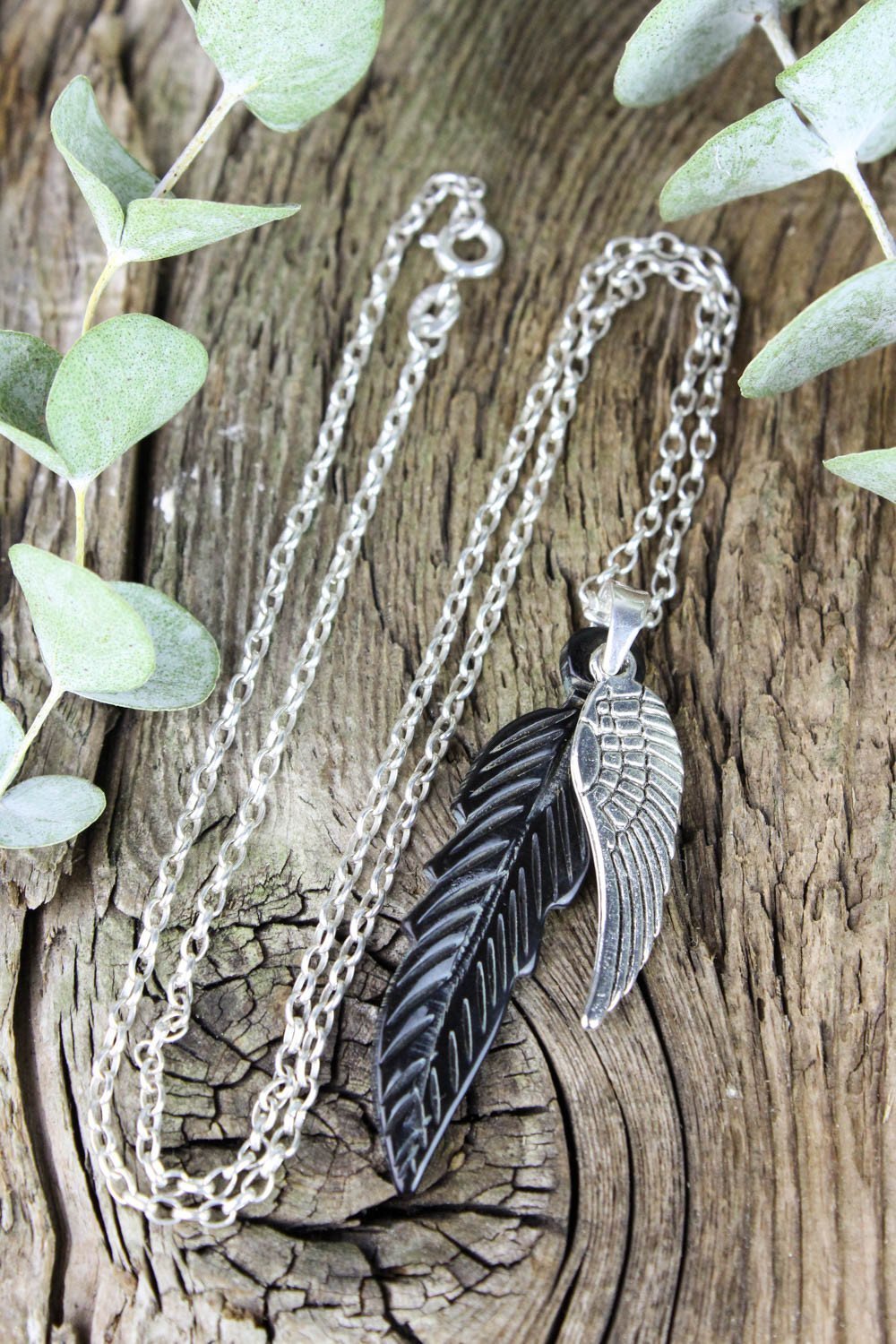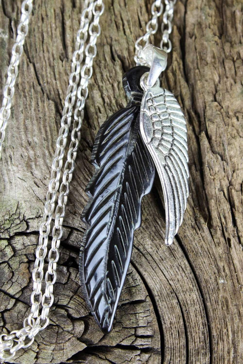 Strung on silver roll chain that is 18 inches long. Bone feather measures approximately 1 7/8 inches long. Wing charm is about 1 1/4 inches.
