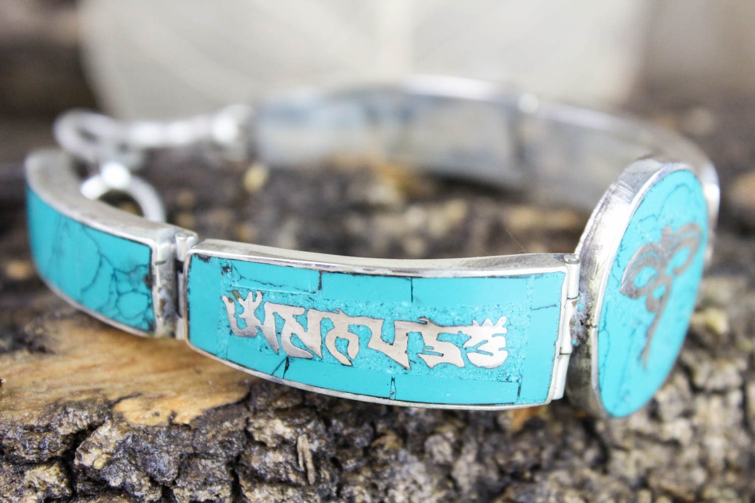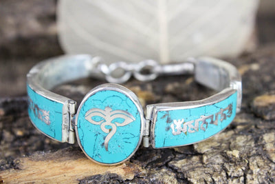 Beautiful pieces of turquoise are hand set into this nicely hinged silver plated bracelet.  The centerpiece features the wisdom eyes of Buddha design with the mantra of compassion, 'om mani padre hung,' in Tibetan script on either side of it.