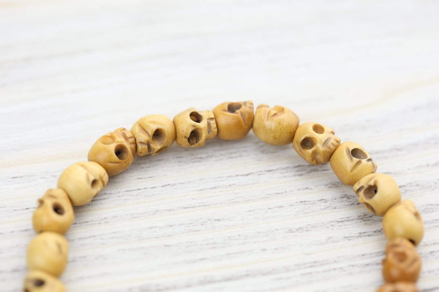 • Each bead is hand carved individually the shape of a skull from yak bone.  The skull in Buddhism is often recognized as a symbol of impermanence.