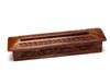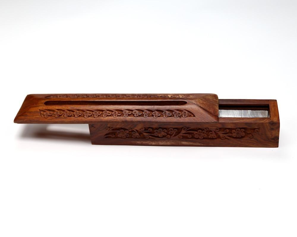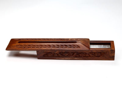 Beautifully hand-carved wooden incense burner box lined with metal. Set traditional incense sticks, cones, or rope alight inside the box and slide the lid closed. The slit in the top allows the perfect flow of smoke. Hand made in Kathmandu, in the ancient city of Bhaktapur.